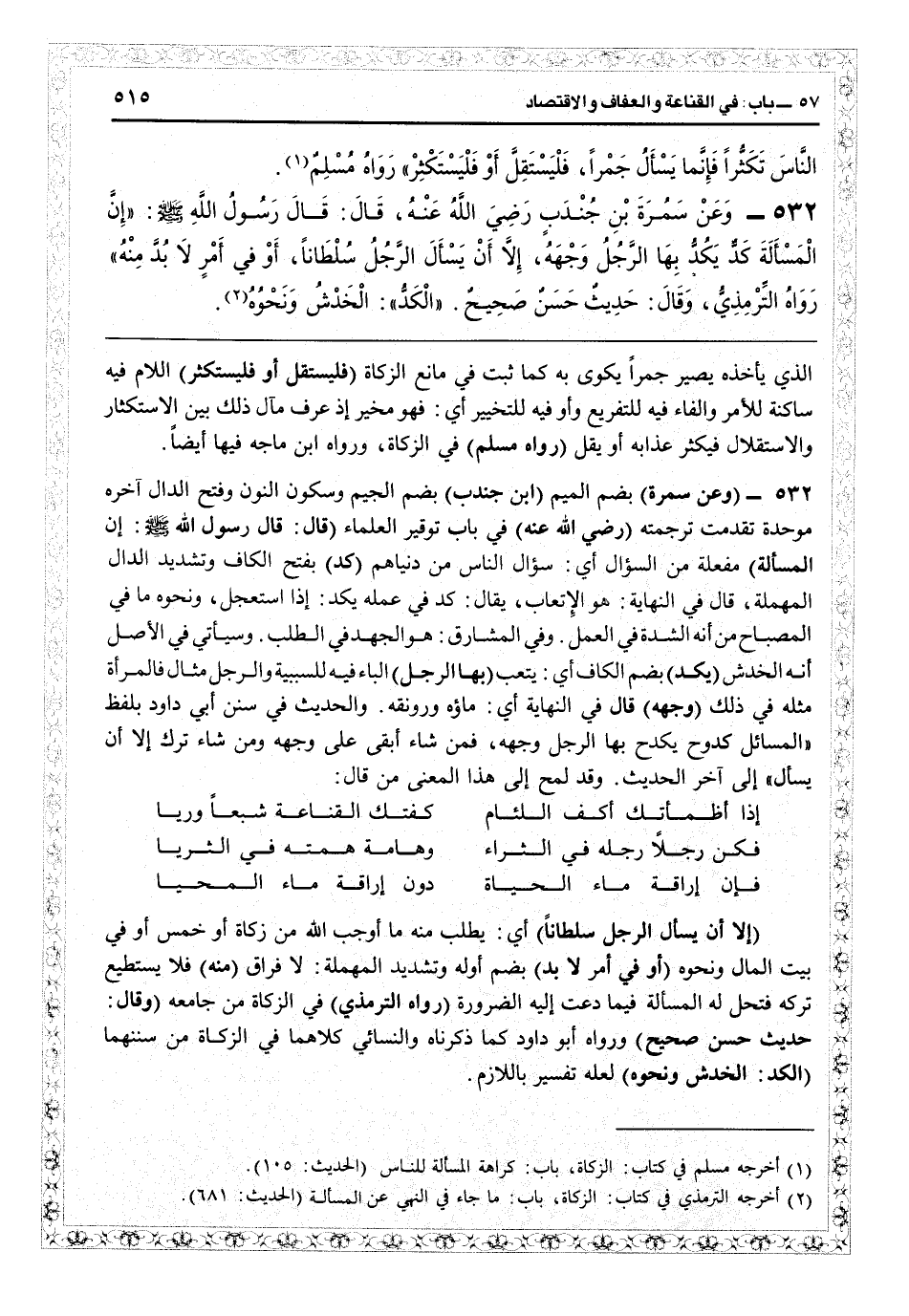 12 - (وعن سمرة) بضم الميم (ابن جندب) بضم الجيم وسكون النون وفتح الدال آخره موحدة تقدمت ترجمته (رضي الله عنه) في باب توقير العلماء (قال: قال رسول الله: إن المسألة) مفعلة من السؤال: أي سؤال الناس من دنياهم (كد) بفتح الكاف وتشديد الدال المهملة، قال في «النهاية» : هو الإتعاب، يقال: كدّ في عمله يكد: إذا استعجل، ونحوه ما في «المصباح» من أنه الشدة في العمل، وفي «المشارق» : هو الجهد في الطلب وسيأتي في الأصل أنه الخدش (يكد) بضم الكاف أي يتعب (بها الرجل) الباء فيه للسببية والرجل مثال فالمرأة مثله في ذلك (وجهه) قال في «النهاية» : أي ماؤه ورونقه، والحديث في «سنن أبي داود» بلفظ: «المسائل كدوح يكدح بها الرجل وجهه، فمن شاء أبقى على وجهه ومن شاء ترك إلا أن يسأل» إلى آخر الحديث، وقد لمح إلى هذا المعنى من قال: