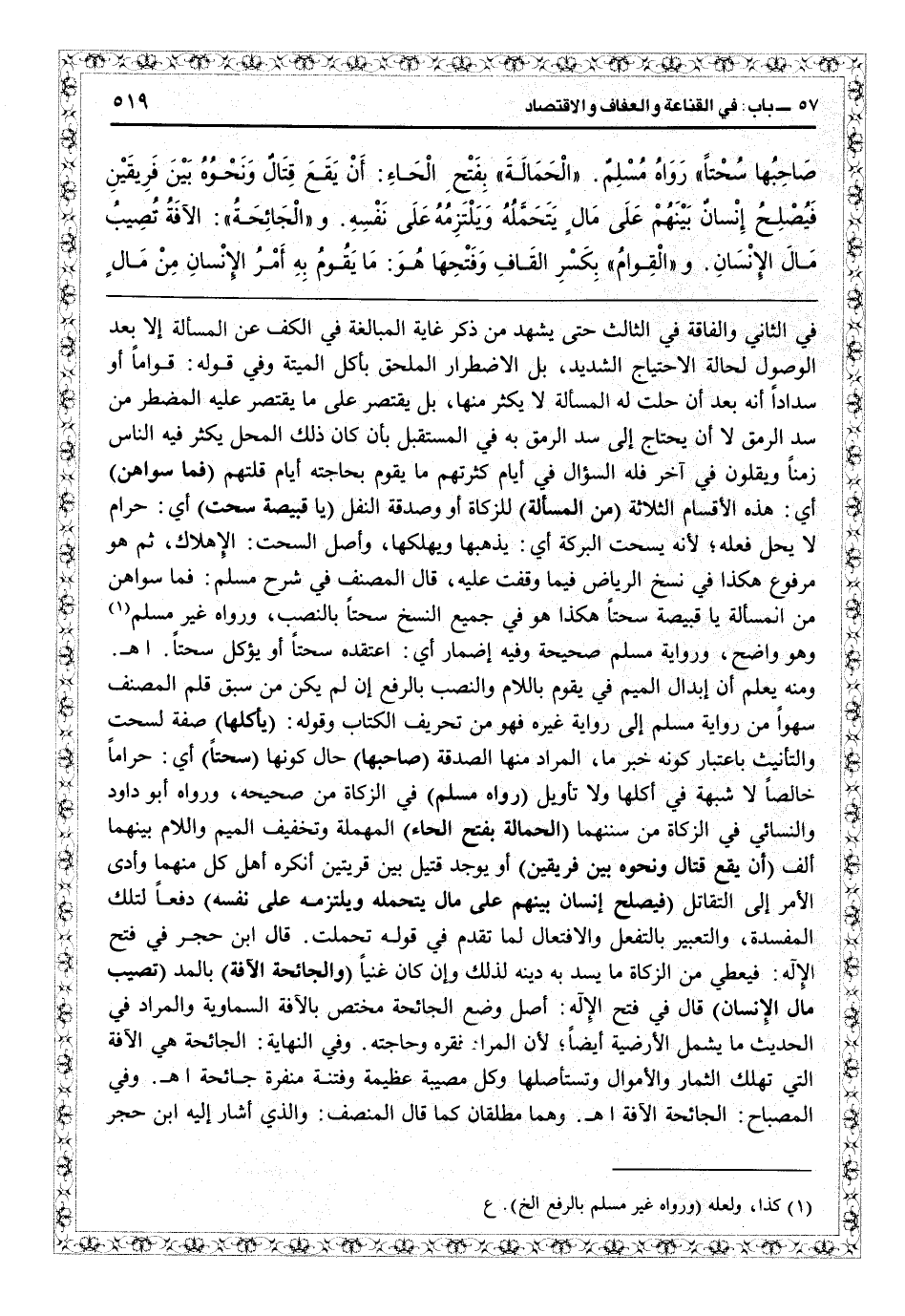 بأكل الميتة وفي قوله: قواماً أو سداداً أنه بعد أن حلت له المسألة لا يكثر منها، بل يقتصر على ما يقتصر عليه المظطر من سد الرمق لا أن يحتاج إلى سد الرمق به في المستقبل بأن كان ذلك المحل يكثر فيه الناس زمناً ويقلون في آخر فله السؤال في أيام كثرتهم ما يقوم بحاجته أيام قلتهم (فما سواهن) أي هذه الأقسام الثلاثة (من المسألة) للزكاة أو وصدقة النفل (يا قبيصة سحت) أي حرام لا يحل فعله لأنه يسحت البركة أي يذهبها ويهلكها، وأصل السحت: الإهلاك، ثم هو مرفوع هكذا في نسخ الرياض فيما وقفت عليه، قال المصنف في شرح مسلم: فما سواهن من المسألة يا قبيصة سحتاً هكذا، هو في جميع النسخ سحتاً بالنصب، ورواه غير مسلم وهو واضح، ورواية مسلم في «صحيحه» وفيه إضمار: أي اعتقده سحتاً أو يؤكل سحتاً اهـ. ومنه يعلم أن إبدال الميم في يقوم باللام والنصب بالرفع إن لم يكن من سبق قلم المصنف سهواً من رواية مسلم إلى رواية غيره فهو من تحريف الكتاب وقوله: (يأكلها) صفة لسحت والتأنيث باعتبار كونه خبر ما، المراد منها الصدقة (صاحبها) حال كونها (سحتاً) أي حراماً خالصاً لا شبهة في أكلها ولا تأويل (رواه مسلم) في الزكاة في «صحيحه» ، ورواه أبو داود والنسائي في الزكاة من «سننهما» (الحمالة بفتح الحاء) المهملة وتخفيف الميم واللام بينهما ألف (أن يقع قتال ونحوه بين فريقين) أو يوجد قتيل بين قريتين أنكره أهل كل منهما وأدى الأمر إلى التقاتل (فبصلح إنسان بينهم على مال يتحمله ويلتزمه على نفسه)