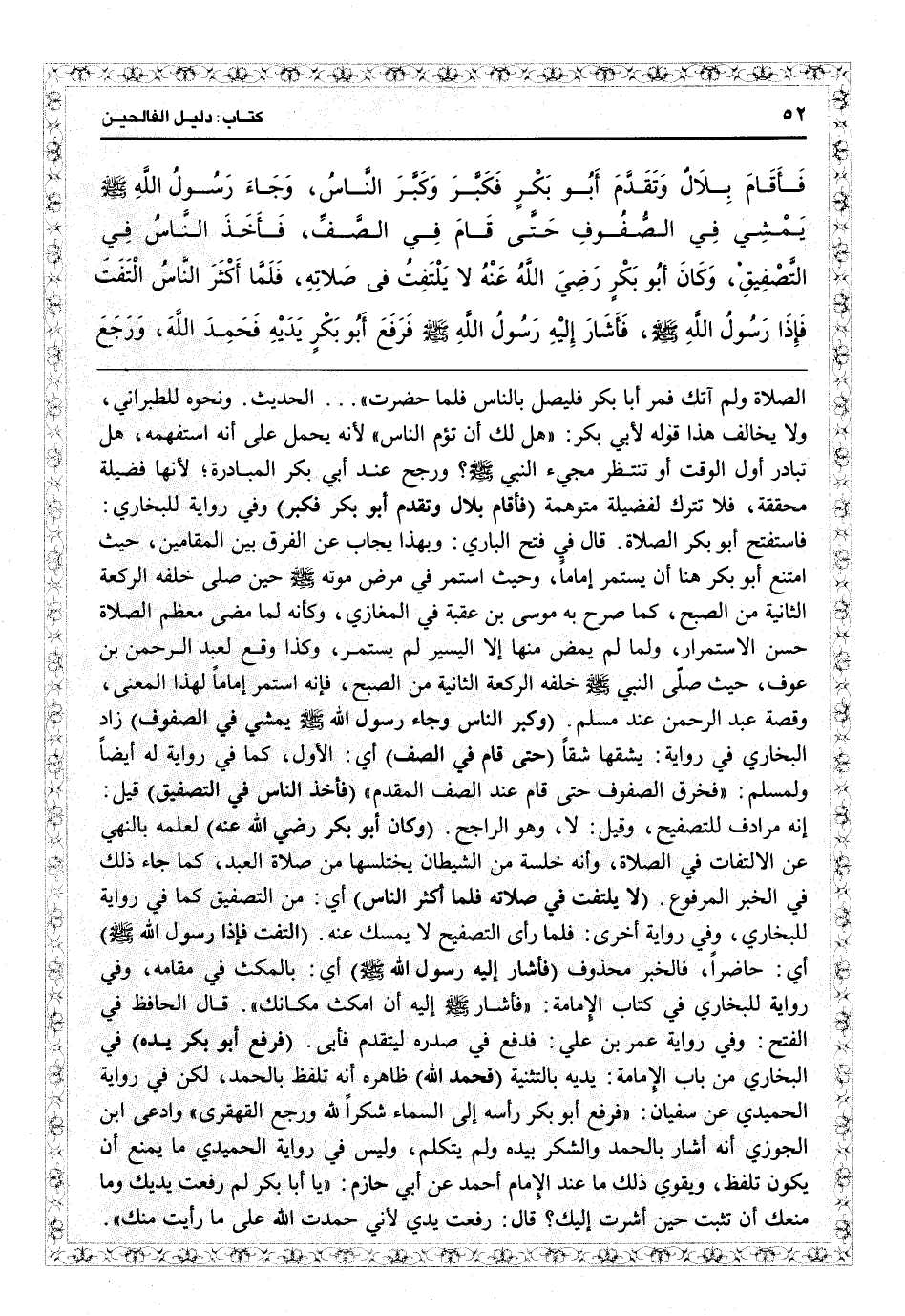إماماً لهذا المعنى، وقصة عبد الرحمن عند مسلم (وكبر الناس وجاء رسول الله - صلى الله عليه وسلم - يمشي في الصفوف) زاد البخاري في رواية: يشقها شقاً (حتى قام في الصف) أي الأول كما في رواية له أيضاً، ولمسلم «فخرق الصفوف حتى قام عند الصفّ المقدم» (فأخذ الناس في التصفيق) قيل إنه مرادف للتصفيح، وقيل لا وهو الراجح (وكان أبو بكر رضي الله عنه) لعلمه بالنهي عن الالتفات في الصلاة وأنه خلسة من الشيطان يختلسها من صلاة العبد كما جاء ذلك في الخبر المرفوع (لا يلتفت في صلاته فلما أكثر الناس) أي من التصفيق كما في رواية للبخاري وفي رواية أخرى «فلما رأى التصفيق لا يمسك عنه» (التفت فإذا رسول الله) أي حاضر فالخبر محذوف (فأشار إليه رسول الله) أي بالمكث في مقامه، وفي رواية للبخاري في كتاب الإمامة «فأشار إليه أن امكث مكانك» . قال الحافظ في «الفتح» : وفي رواية عمر بن علي: فدفع في صدره ليتقدم فأبى (فرفع أبو بكر يده) في البخاري من باب الإمامة يديه بالتثنية (فحمد الله) ظاهره أنه تلفظ بالحمد لكن في رواية الحميدي عن سفيان «فرفع أبو بكر رأسه إلى السماء شكراً ورجع القهقرى» وأدعى ابن الجوزي أنه أشار بالحمد والشكر بيده ولم يتكلم، وليس في رواية الحميدي ما يمنع أن يكون تلفظ، ويقوّي ذلك ما عند الإمام أحمد عن أبي حازم «يا أبا بكر لم رفعت يديك وما منعك أن تثبت حين أشرت إليك؟ قال: رفعت يديّ لأني حمدت الله على ما رأيت منك»