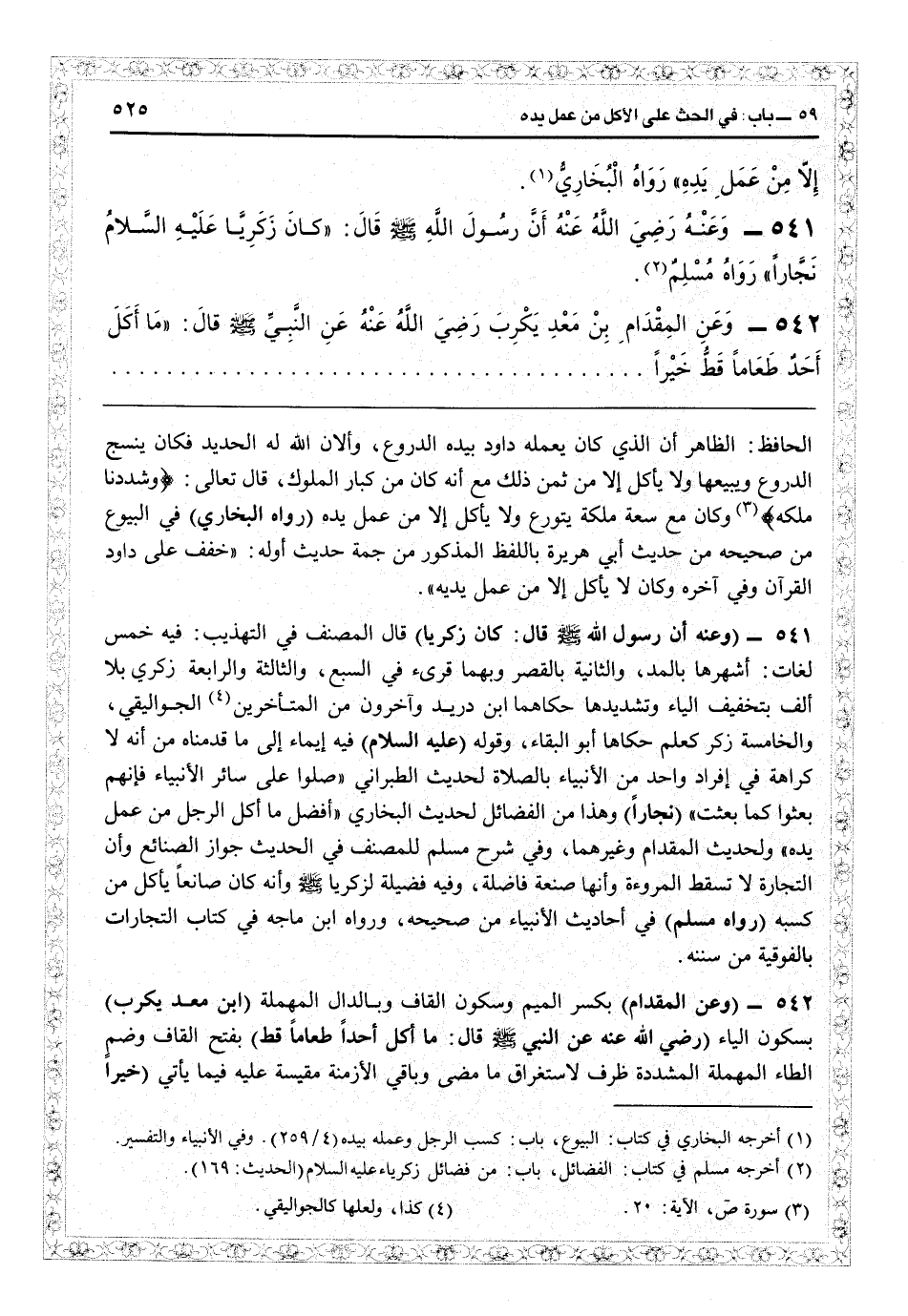 4 - (وعنه أن رسول الله - صلى الله عليه وسلم - قال: كان زكريا) قال المصنف في «التهذيب» : فيه خمس لغات: أشهرها بالمدّ، والثانية بالقصر وبهما قرىء في السبع، والثالثة والرابعة زكري بلا ألف بتخفيف الياء وتشديدها حكاهما ابن دريد وآخرون من المتأخرين الجواليقي، والخامسة زكر كعلم حكاها أبو البقاء، وقوله: (عليه السلام) فيه إيماء إلى ما قدمناه من أنه لا كراهة في إفراد واحد من الأنبياء بالصلاة لحديث الطبراني: «صلوا على سائر الأنبياء فإنهم بعقوا كما بعثت» (نجاراً) وهذا من الفضائل لحديث البخاري: «أفضل ما أكل الرجل من عمل يده» ولحديث المقدام وغيرهما، وفي «شرح مسلم» للمصنف في الحديث جواز الصنائع وأن النجارة لا تسقط المروءة وأنها صنعة فاضلة، وفيه فضيلة لزكريا وأنه كان صانعاً يأكل من كسبه (رواه مسلم) في أحاديث الأنبياء من «صحيحه» ، ورواه ابن ماجه في كتاب التجارات بالفوقية من «سننه» .