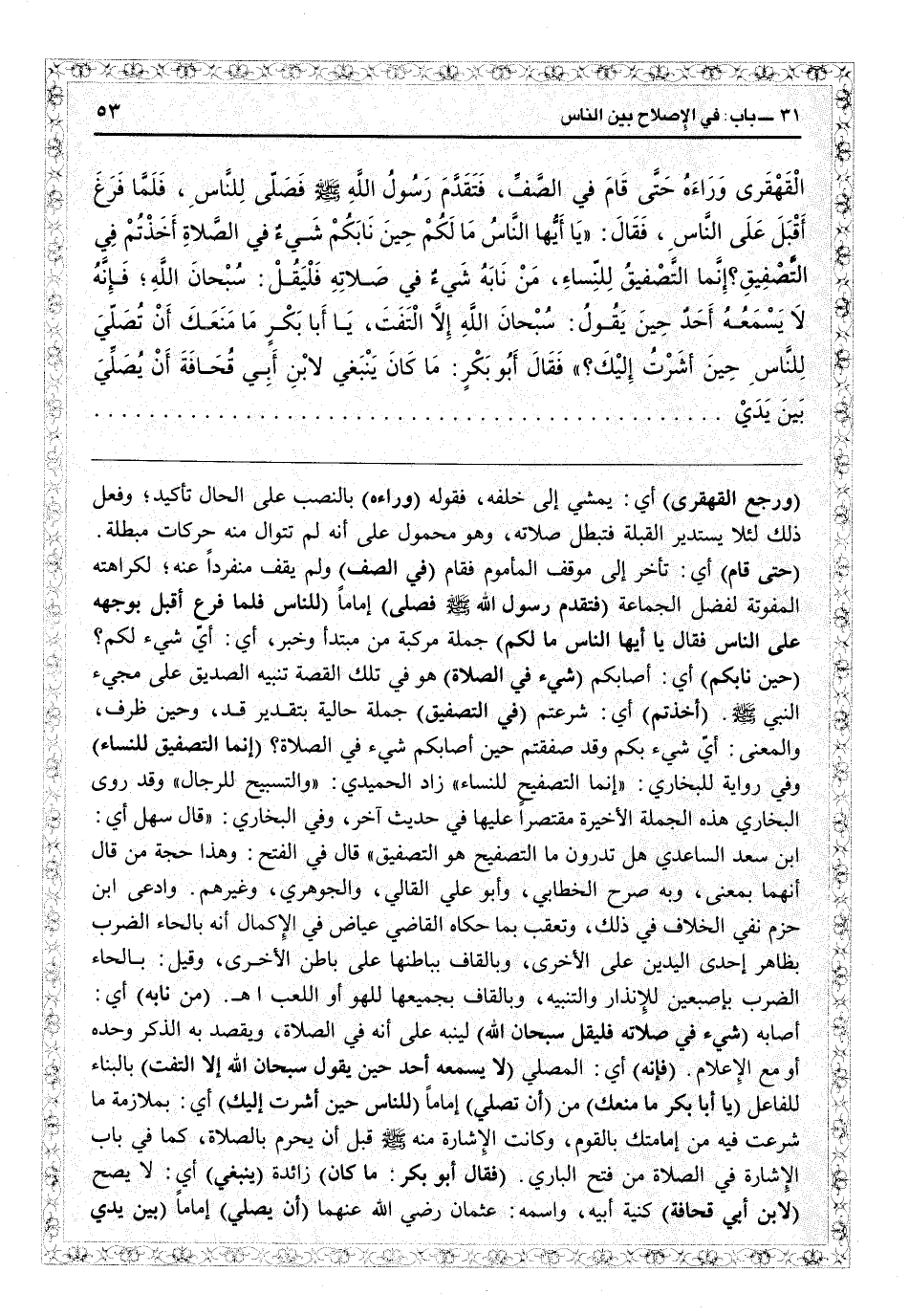 لكم؟ (حين نابكم) أي أصابكم (شيء في الصلاة) هو في تلك القصة تنبيه الصديق على مجيء النبي (ذتم) أي شرعتم (في التصفيق) جملة حالية بتقدير قد وحين ظرف. والمعنى: أي شيء بكم وقد صفقتم حين أصابكم شيء في الصلاة (إنما التصفيق للنساء) وفي رواية البخاري إنما التصفيح للنساء» زاد الحميدي «والتسبيح للرجال» وقد روى البخاري هذه الجملة الأخيرة مقتصراً عليها