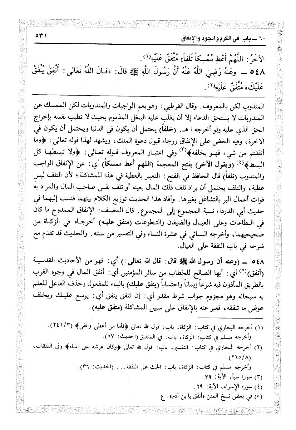 المندوب لكن بالمعروف، وقال القرطبي: هو يعم الواجبات والمندوبات لكن الممسك عن المندوبات لا يستحق الدعاء إلا أن يغلب عليه البخل المذموم بحيث لا تطيب نفسه بإخراج الحق الذي عليه ولو أخرجه اهـ (خلفاً) يحتمل أن يكون في الدنيا ويحتمل أن يكون في الآخرة، وفيه الحض على الإنفاق ورجاء قبول دعوة الملك، وبشهد لهذا قوله تعالى: {وما أنفقتم من شيء فهو بخلفه} (سبأ: 39) وفي اعتبار المعروف قوله تعالى: {ولا تبسطها كل البسط} (الإسراء: 4) (ويقول الآخر) بفتح المعجمة (اللهم أعط ممسكاً) أي عن الإنفاق الواجب والمندوب (تلفاً) قال الحافظ في «الفتح» : التعبير بالعطية في هذا للمشاكلة لأن التلف ليس عطية، والتلف يحتمل أن يراد تلف ذلك المال بعينه أو تلف نفس صاحب المال والمراد به فوت أعمال البر بالتشاغل بغيرها، وأفاد هذا الحديث توزيع الكلام بينهما فنسب إليهما في حديث أبي الدرداء نسبة المجموع إلى المجموع. قال المصنف: الإنفاق الممدوح ما كان في الطاعات وعلى العيال والضيفان والتطوعات (متفق عليه) أخرجاه في الزكاة من «صحيحهما» ، وأخرجه النسائي في عشرة النساء وفي التفسير من