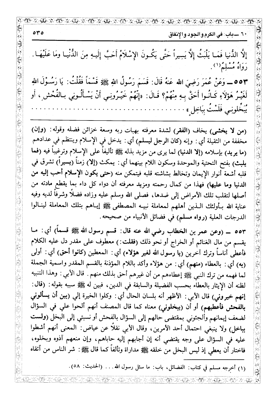 11 - (وعن عمر) بن الخطاب (رضي الله عنه قال: قسم رسول الله - صلى الله عليه وسلم - قسماً) أي ما يقسم من ماله الغنائم أو الخراج أو نحو ذلك (فقلت) معطوف على مقدر دل عليه الكلام فأعطى أناساً وترك آخرين (يا رسول الله لغير هؤلاء) أي المعطين (كانوا أحق) أي أولى (به) أي بالعطاء (منهم) أي من هؤلاء وآكد باللام المؤذنة بالقسم المقدر وإسمية الجملة لما فهمه من ترك النبي إعطاءهم من أن غيرهم أحق بذلك منهم، قال الأبي: وهذا التنبيه لظنه أن الإيثار بالعطاء بحسب الفضيلة والسابقة في الدين، فبين له سببه بقوله: (قال: إنهم خيروني) قال الأبي: الأظهر أنه بلسان الحال: أي وكلوا الخيرة إلى (بين أن يسألوني بالفحش فأعطيهم) أو أن (يبخلوني) معناه كما قال المصنف أنهم ألحوا عليّ في السؤال لضعف إيمانهم وألجئوني بمقتضى حالهم إلى السؤال بالفحش أو بنسبتي إلى البخل (ولست بباخل) ولا ينبغي احتمال أحد الأمرين، وقال الأبي نقلاً عن عياض: المعنى أنهم أشطوا عليه في السؤال على وجه يقتضي أنه إن أجابهم إليه حاباهم، وإن منعهم آذوه وبخلوه، فاختار أن يعطي إذ ليس البخل من خلقه مداراة وتألفاً كما قال: «شرّ الناس من اتقاه