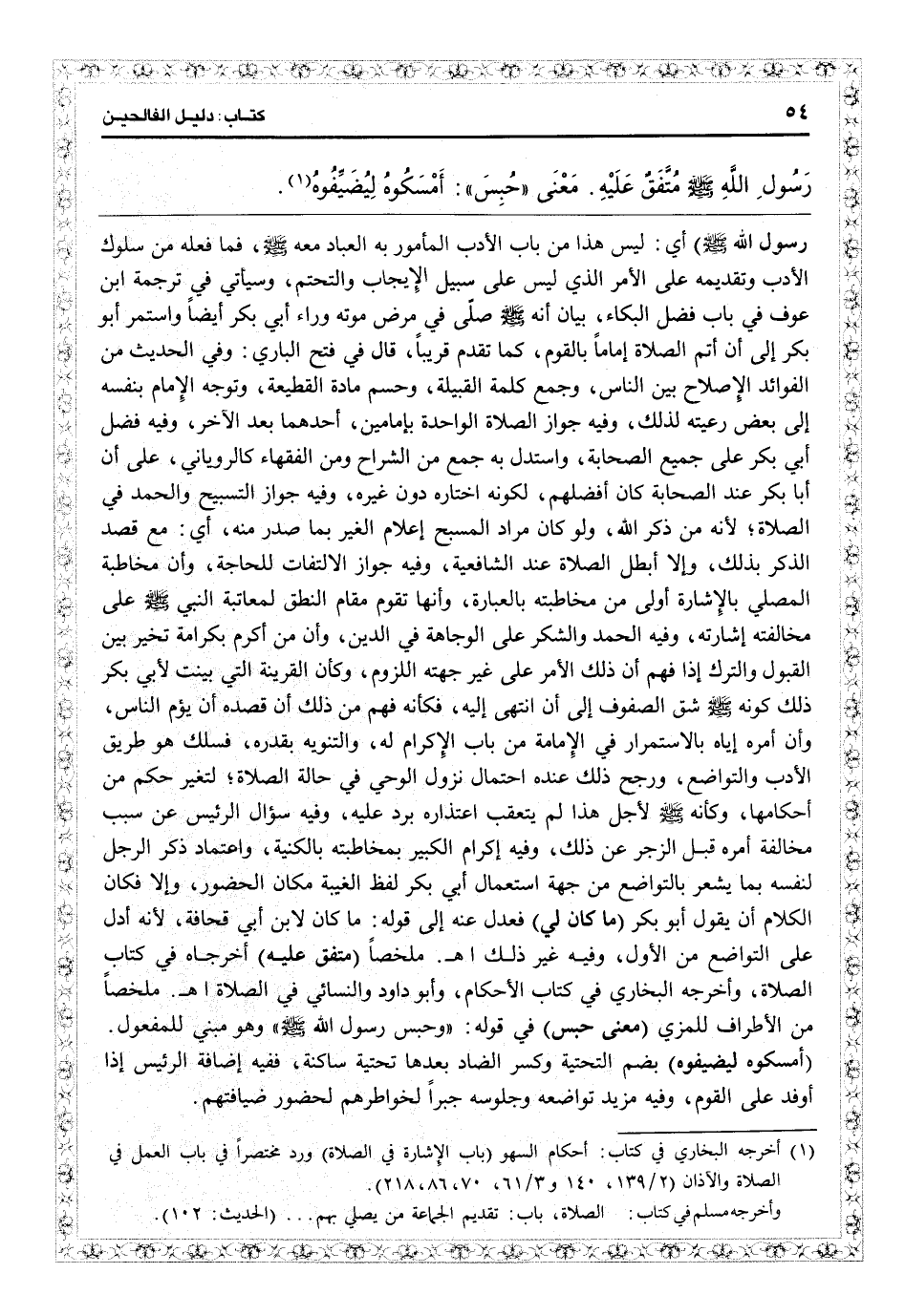 الإصلاح بين الناس، وجمع كلمة القبيلة، وحسم مادة القطيعة، وتوجه الإمام بنفسه إلى بعض رغبته لذلك، وفيه جواز الصلاة الواحدة بإمامين أحدهما بعد الآخر، وفيه فضل أبي بكر على جميع الصحابة. واستدل به جمع من الشراح ومن الفقهاء كالروياني على أن أبا بكر عند الصحابة كان أفضلهم لكونه اختاره دون غيره، وفيه جواز التسبيح والحمد في الصلاة لأنه من ذكرالله، ولو كان مراد المسبح إعلام الغير بما صدر منه: أي من قصد الذكر بذلك وإلا أبطل الصلاة عند الشافعية. وفيه جواز الالتفات للحاجة. وأن مخاطبة المصلي بالإشارة أولى من مخاطبته بالعبارة، وأنها تقوم مقام النطق لمعاتبة النبي على مخالفته إشارته، وفيه الحمد والشكر على الوجاهة في الدين، وأن من أكرم بكرامة تخير بين القبول والترك إذا فهم أن ذلك الأمر على غير جهة اللزوم، وكأن القرينة التي بينت لأبي بكر ذلك كونه شق الصفوف إلى أن انتهى إليه، فكأنه فهم من ذلك أن قصده أن يؤمّ الناس وأن أمره إياه بالاستمرار في الإمامة من باب الإكرام له والتنويه بقدره، فسلك هو طريق الأدب والتواضع ورجح ذلك عنده احتمال نزول الوحي في حالة الصلاة لتغير حكم من أحكامها، وكأنه لأجل هذا لم يتعقب اعتذاره برد عليه. وفيه سؤال الرئيس عن سبب مخالفة أمره قبل الزجر عن ذلك، وفيه إكرام الكبير بمخاطبته بالكنية واعتماد ذكر الرجل لنفسه بما يشعر بالتواضع من جهة استعمال أبي بكر لفظ الغيبة مكان الحضور، وإلا فكان الكلام أن يقول أبو بكر ما كان لي فعدل عنه إلى قوله: ما كان لابن أبي قحافة لأنه أول على التواضع من الأول. وفيه غير ذلك اهـ. ملخصاً (متفق عليه) أخرجاه في كتاب الصلاة وأخرجه البخاري في كتاب الأحكام وأبو داود والنسائي في الصلاة اهـ. ملخصاً من «الأطراف» للمزي (معنى حبس) في «وحبس رسول الله» وهو مبني للمفعول (أمسكوه ليضيفوه) بضم التحتية وكسر الضاد بعدها تحتية ساكنة، ففيه إضافة الرئيس إذا أوفد على