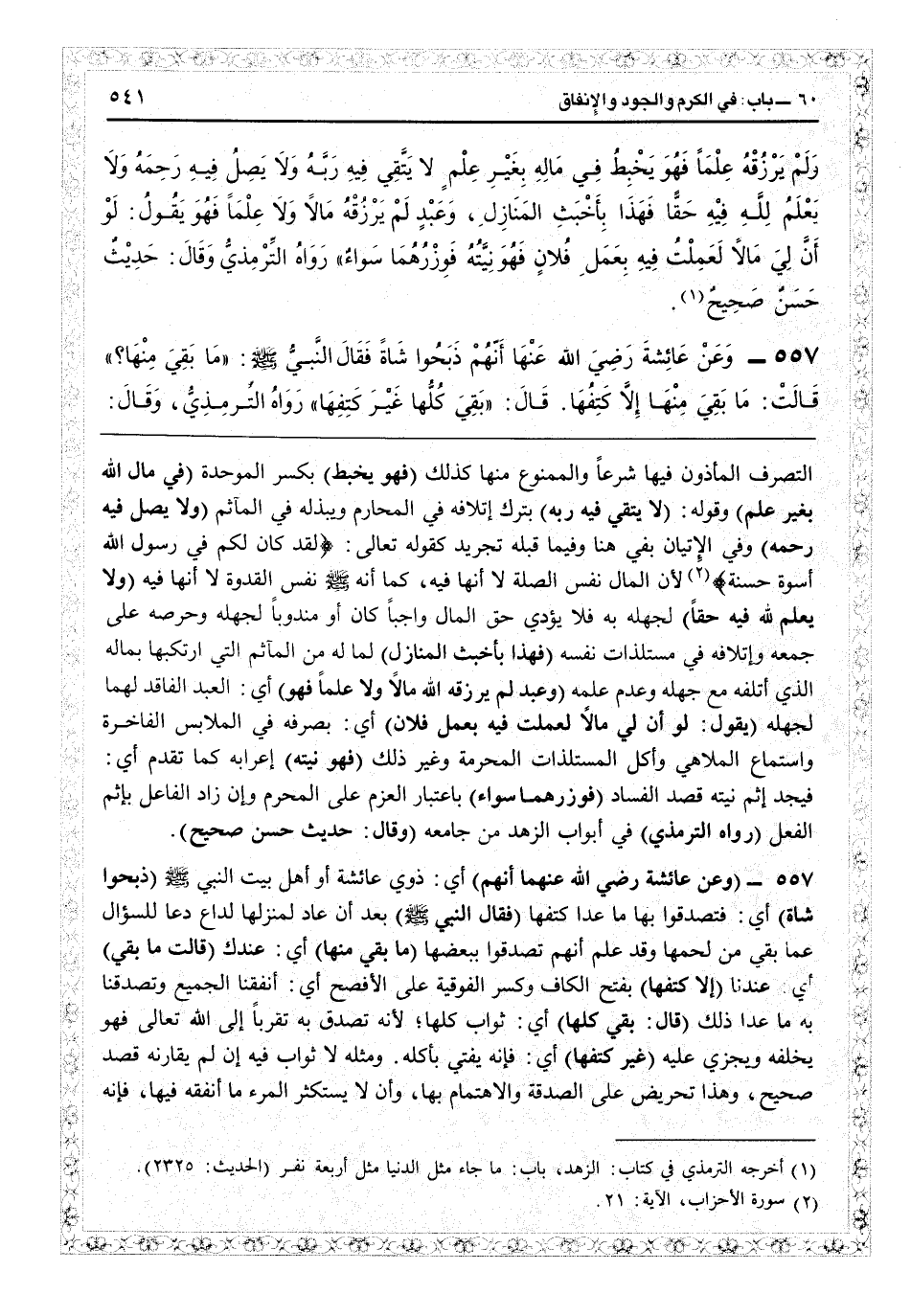 {لقد كان لكم في رسول الله أسوة حسنة} (الأحزاب: 21) لأن المال نفس الصلة لا أنها فيه، كما أنه نفس القدوة لا أنها فيه (ولا يعلم فيه حقاً) لجهله به فلا يؤدي حق المال واجباً كان أو مندوباً لجهله وحرصه على جمعه وإتلافه في مستلذات نفسه (فهذا بأخبث المنازل) لماله من المآثم التي ارتكبها بمال الذي أتلفه مع جهله وعدم علمه (وعبد لم يرزقه الله مالاً ولا علماً فهو) أي العبد الفاقد لهما لجهله (يقول: لو أن لي مالاً لعملت فيه بعمل فلان) أي بصرفه في الملابس الفاخرة واستماع الملاهي وأكل المستلذات المحرمة وعير ذلك (فهو نيته) إعرابه كما تقدم أي فيجد إثم نيته قصد الفصاد (فوزرهما سواء) باعتبار العزم على المحرم وإن زاد الفاعل بإثم الفعل (رواه الترمذي) في أبواب الزهد من «جامعه» (وقال: حديث حسن صحيح) .