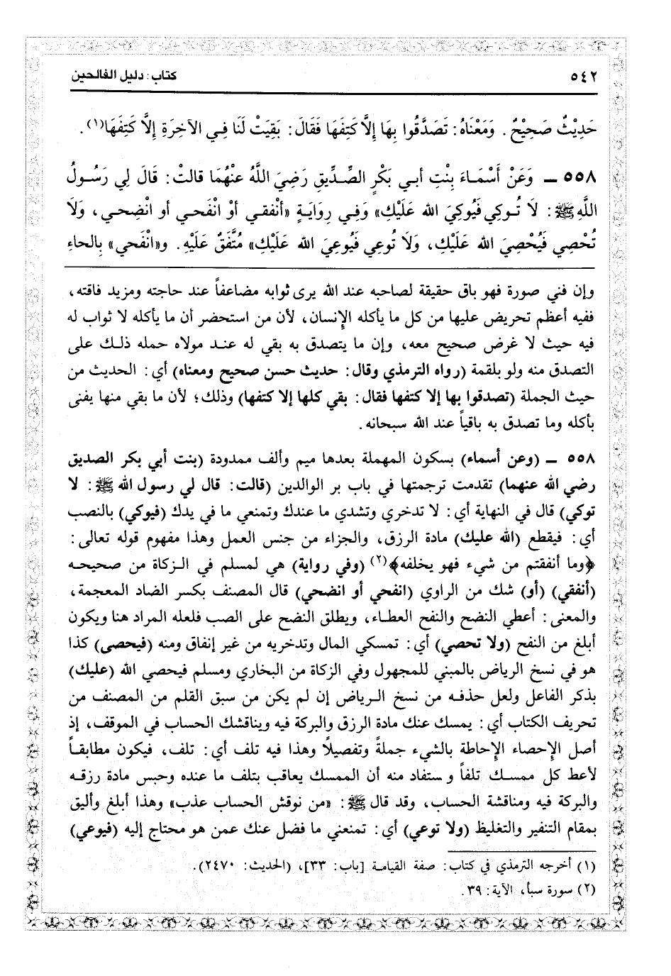 (وفي رواية) هي لمسلم في الزكاة من «صحيحه» (أنفقي أو) شك من الراوي (انفحي أو انضحي) قال المصنف: بكسر الضاد المعجمة، والمعنى: أعطي النضح والنفح العطاء، ويطلق النضح على الصبّ فلعله المراد هنا ويكون أبلغ من النفح (ولا تحصي) أي تمسكي المال وتدخريه من غير إنفاق منه (فيحصى) كذا هو في نسخ الرياض بالمبنى للمجهول وفي الزكاة من البخاري ومسلم فيحصي الله (عليك) بذكر الفاعل ولعل حذفه من نسخ الرياض إن لم يكن من سبق القلم من المصنف من تحريف الكتاب: أي يمسك عنك مادة الرزق والبركة فيه ويناقشك الحساب في الموقف، إذ أصل الإحاطة بالشيء جملة وتفصيلاً، وهذا فيه تلف أيّ تلف، فيكون مطابقاً لأعط كل ممسك تلفاً، ويستفاد منه أن الممسك يعاقب بتلف ما عنده وحبس مادة رزقه والبركة فيه ومناقشة الحساب، وقد قال: «من نوقش الحساب عذّب» وهذا أبلغ وأليق بمقام التنفير والتغليظ (ولا توعي) أي لا تمنعي ما فضل عنك عمن هو محتاج إليه (فيوعي)