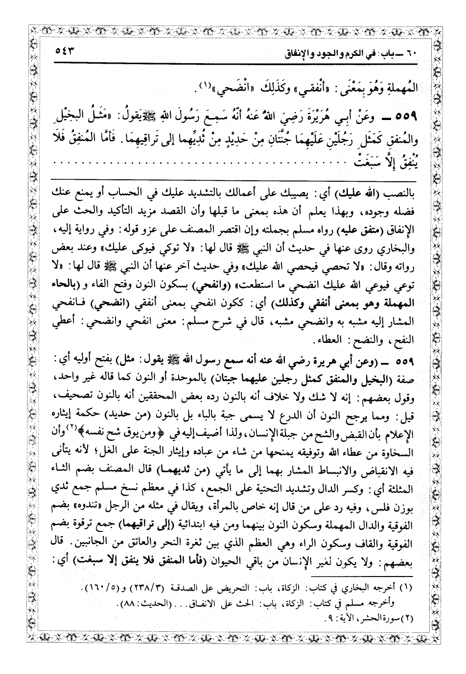 بالنصب (اعليك) أي يصيبك على أعمالك بالتشديد عليك في الحساب أو يمنع عنك فضله وجوده، وبهذا يعلم أن هذه بمعنى ما قبلها وأن القصد مزيد التأكيد والحث على الإنفاق (متفق عليه) رواه مسلم بجملته وإن اقتصر المصنف على عزو قوله وفي رواية إليه، والبخاري روى عنها في حديث أن النبي قال لها: «لا توكي فيوكى عليك» وعند بعض رواته قال: «لا تحصي فيحصي الله عليك» وفي حديث آخر عنها أن النبي قال لها: «لا توعي فيوعي الله عليك انضحي ما استطعت» (وانفحي) بسكون النون وفتح الفاء (وبالحاء المهملة وهو بمعنى أنفقي وكذلك) أي ككون انفحي بمعنى أنفقي (أنضحي) فانفحي المشار إليه مشبه به وانضحي مشبه، قال في «شرح مسلم» : معنى انفحي وانضحي: أعطي النفح، والنضح: العطاء.
