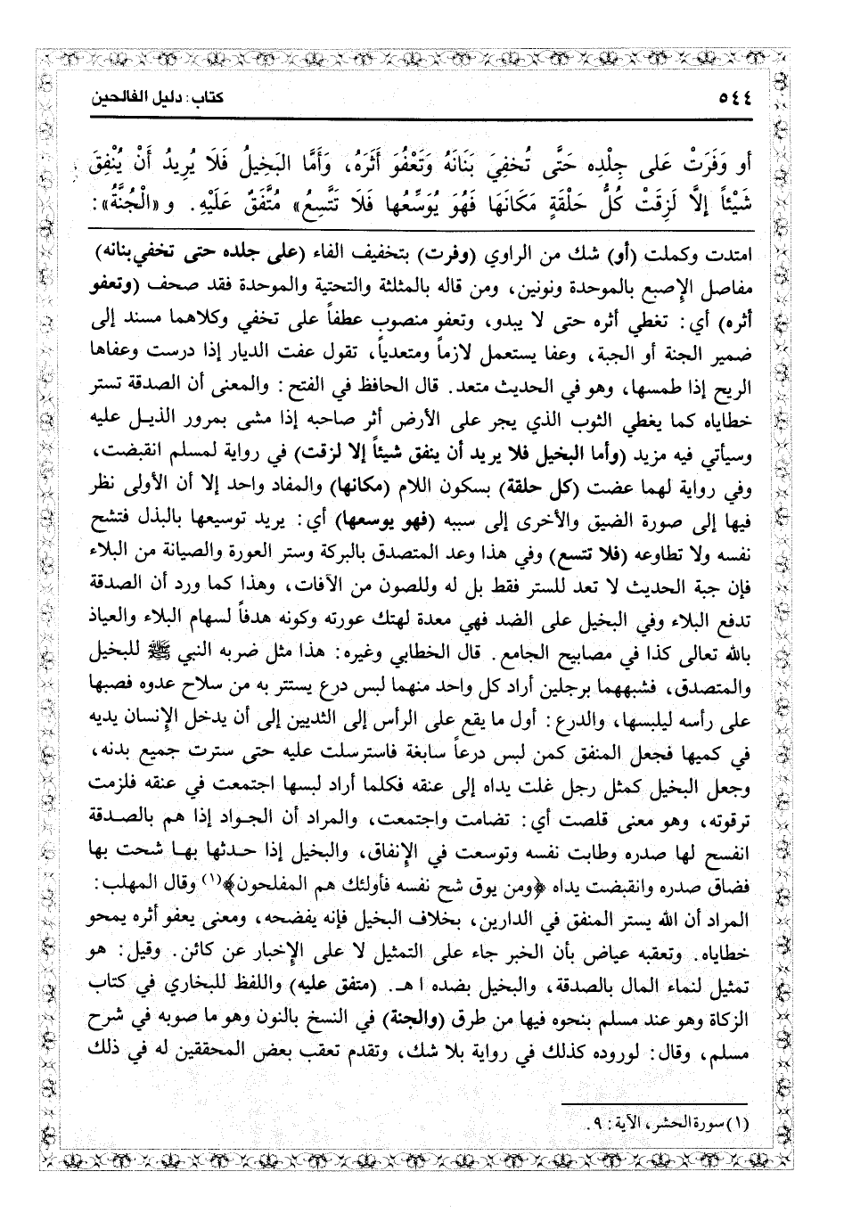 {ومن يوق شح نفسه فأولئك هم المفلحون} (الحشر: 9) وقال المهلب: المراد أن الله يستر المنفق في الدارين، بخلاف البخيل فإنه يفضحه، ومعنى يعفو أثره يمحو خطاياه. وتعقبه عياض بأن الخبر جاء على التمثيل لا على الإخبار عن كائن. وقيل: هو تمثيل لنماء المال بالصدقة، والبخيل بضده اهـ (متفق عليه) واللفظ للبخاري في كتاب الزكاة وهو عند مسلم بنحوه فيها من طرق (والجنة) في النسخ بالنون وهو ما صوّبه في «شرح مسلم» ، وقال لوروده كذلك في رواية بلا شك، وتقدم تعقب بعض المحققين له في ذلك