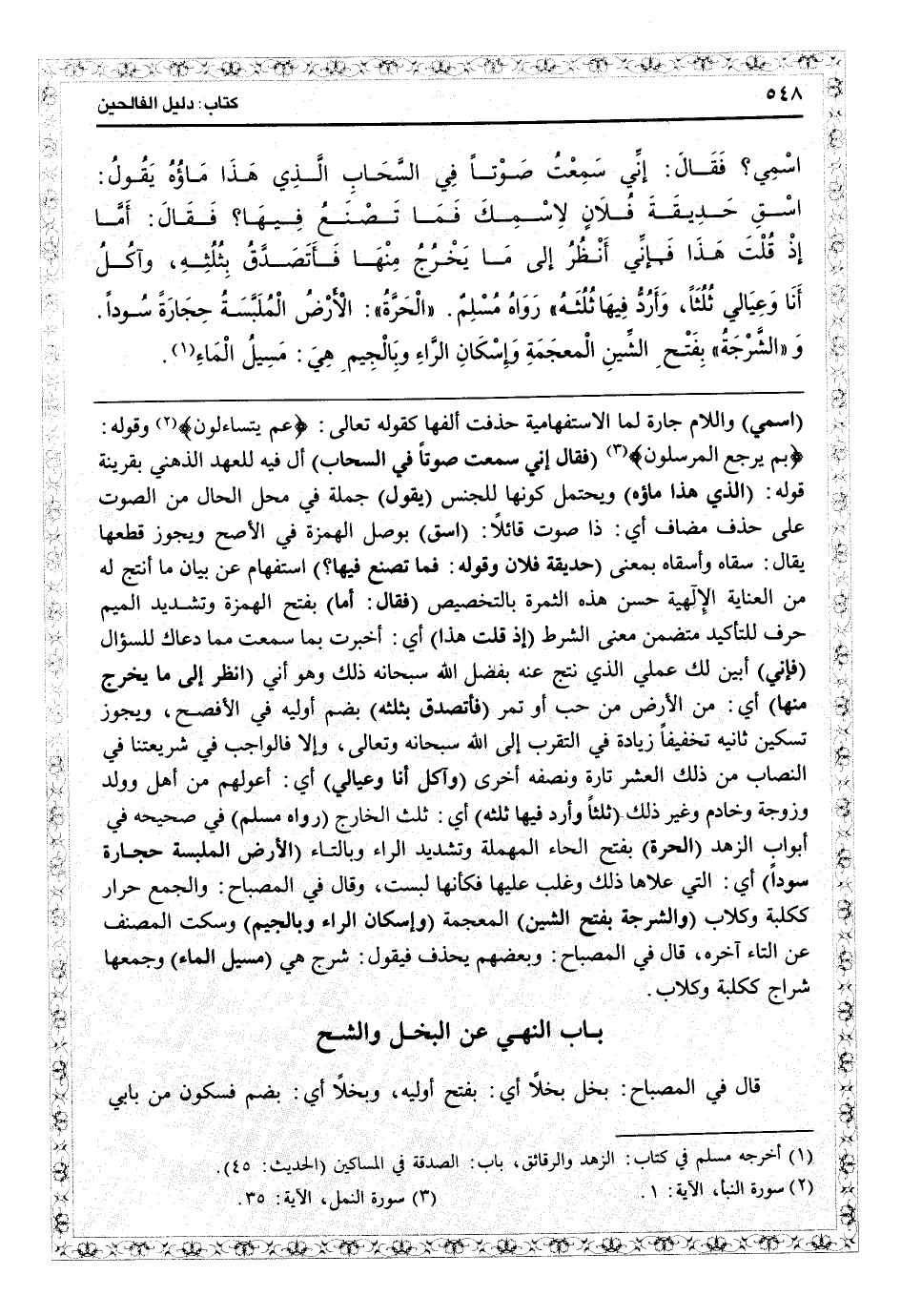 {عم يتساءلون} (النبأ: 1) وقوله: {بم يرجع المرسلون} (النمل: 35) (فقال: إني سمعت صوتاً في السحاب) أل فيه للعهد الذهني بقرينة قوله: (الذي هذا ماؤه) ويحتمل كونها للجنس (يقول) جملة في محل الحال من الصوت على حذف مضاف: أي ذا صوت قائلاً (اسق) بوصل الهمزة في الأصح ويجوز قطعها، يقال: ما أنتج له من العناية الإلهية حسن هذه الثمرة بالتخصيص (فقال: أما) بفتح الهمزة وتشديد الميم حرف للتأكيد متضمن معنى الشرط (إذا قلت هذا) أي أخبرت بما سمعت مما دعاك للسؤال (فإني) أبين لك عمل الذي نتج عنه بفضل الله سبحانه ذلك وهو أني (أنظر إلى ما يخرج منها) أي من الأرض من حب أو ثمر (فأتصدق بثلثه) بضم أوليه في الأفصح، ويجوز تسكين ثانيه تخفيفاً زيادة في التقرب إلى الله سبحانه وتعالى، وإلا فالواجب في شريعتنا في النصاب من ذلك العشر تارة ونصفه أخرى (وآكل أنا وعيالي) أي أعولهم من أهل وولد وزوجة وخادم وغير ذلك (ثلثاً وأرد فيها ثلثه) أي ثلث الخارج (رواه مسلم) في «صحيحه» في أبواب الزهد (الحرة) بفتح الحاء المهملة وتشديد الراء وبالتاء (الأرض الملبسة حجارة سودا) أي التي علاها ذلك وغلب عليها فكأنها لبست، وقال في «المصباح» : والجمع حرار كلكبة وكلاب (والشرجة بفتح الشين المعجمة وإسكان الراء وبالجيم) وسكت المصنف عن التاء آخره، قال في «المصباح» : وبعضهم يحذف فيقول: شرج هي (مسيل الماء) وجمعها شراج ككلبة وكلاب.