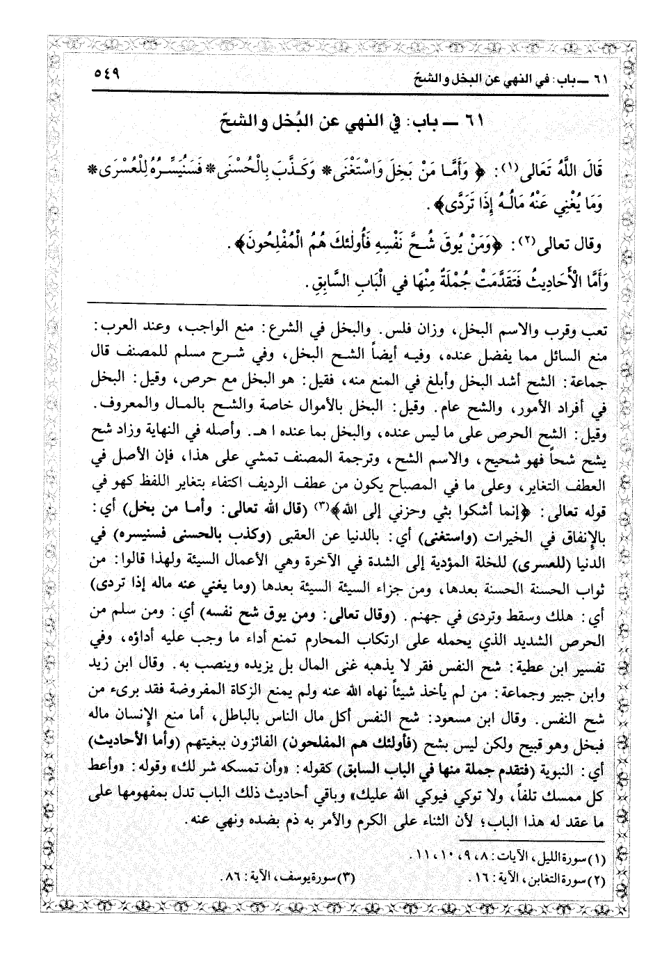 (وقال تعالى) : ( {ومن يوق شحّ نفسه} ) أي ومن سلم من الحرص الشديد الذي يحمله على ارتكاب المحارم بمنع أداء ما وجب عليه أداؤه، وفي تفسير ابن عطية: شحّ النفس فقر لا يذهبه غنى المال، بل يزيده وينصب به. وقال ابن زيد وابن جبير وجماعة: من لم يأخذ شيئاً نهاه الله عنه ولم يمنع الزكاة المفروضة فقد برىء من شحّ النفس. وقال ابن مسعود: شحّ النفس أكل مال الناس بالباطل، أما منع الإنسان ماله فبخل وهو قبيح ولكن ليس بشحّ ( {فأولئك هم المفلحون} ) الفائزون ببغيتهم (وأما الأحاديث) أي النبوية (فتقدمت جملة منها في الباب السابق) كقوله: «وإن تمسكه شرّ لك» وقوله: «وأعط كل ممسك تلفاً، ولا توكي فيوكي الله عليك» وباقي أحاديث ذلك الباب تدل بمفهومها على ما عقد له هذا الباب لأن الثناء على الكرم والأمر به ذم بضده ونهي عنه.