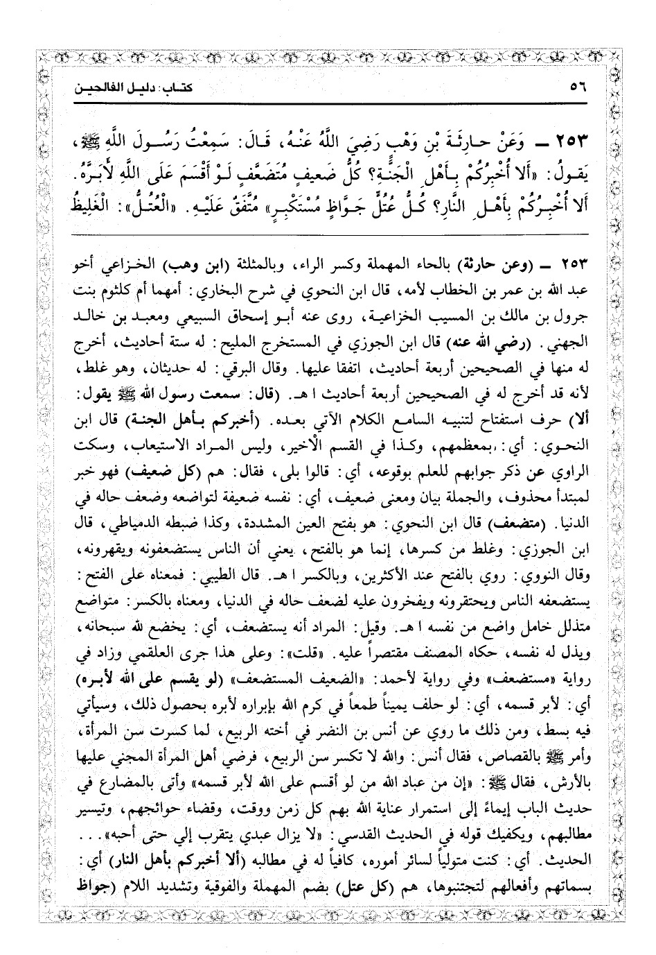2521 - (وعن حارثة) بالحاء المهملة وكسر الراء وبالمثلثة (ابن وهب) الخزاعي أخو عبد الله بن عمر بن الخطاب لأمه. قال ابن النحوي في شرح البخاري: أمهما أم كلثوم بنت جرول بن مالك بن المسيب الخزاعية. روى عنه أبو إسحاق السبيعي ومعبد بن خالد الجهني (رضي الله عنه) قال ابن الجوزي في المستخرج المليح: له ستة أحاديث أخرج له منها في «الصحيحين» أربعة أحاديث اتفقا عليها. وقال البرقي: له حديثان، وهو غلط لأنه قد أخرج له في «الصحيحين» أربعة أحاديث اهـ. (قال سمعت رسول الله - صلى الله عليه وسلم - يقول: ألا) حرف استفتاح لتنبيه السامع للكلام الآتي بعده (أخبركم بأهل الجنة) قال ابن النحوي: أي بمعظمهم وكذا في القسم الأخير وليس المراد الاستيعاب، وسكت الراوي عن ذكر جوانبهم للعلم بوقوعه: أي قالوا: بلى فقال: هم (كل ضعيف) فهو خبر لمبتدأ محذوف والجملة بيان، ومعنى ضعيف: أي نفسه ضعيفة لتواضعه وضعف حاله في الدنيا (متضعف) قال ابن النحوي هو بفتح العين المشددة وكذا ضبطه الدمياطي. قال ابن الجوزي: وغلط من كسرها إنما هو بالفتح، يعني أن الناس يستضعفونه ويقهرونه. وقال النووي: روى بالفتح عند الأكثرين وبالكسر اهـ: قال الطيبي: فمعناه على «الفتح» يستضعفه الناس ويحتقرونه ويفخرون عليه لضعف حاله في الدنيا ومعناه بالكسر متواضع متذلل خامل واضع من نفسه اهـ. وقيل المراد أنه يستضعف: أي يخضع سبحانه ويذل له نفسه، حكاه المصنف مقتصراً عليه. قلت: وعلى هذا جرى العلقمي وزاد في رواية «مستضعف» .