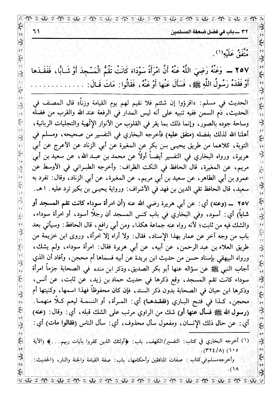 الحديث في مسلم «اقرءوا إن شئتم فلا نقيم لهم يوم القيامة وزناً» قال المصنف: في الحديث ذم السمن، ففيه تنبيه على أنه ليس الدار في الرفعة عند الله والقرب من فضله وساحة جرده بالصور، وإنما ذلك بما يقرّ في القلوب من الأنوار الإلهية والتجليات الربانية أهلَّنا الله لذلك بفضله (متفق عليه) فأخرجه البخاري في «التفسير» من «صحيحه» ومسلم في التوبة كلاهما من طريق يحيى بن بكير عن المغيرة عن أبي الزناد عن الأعرج عن أبي هريرة ورواه البخاري في التفسير أيضاً أولاً عن محمد بن عبد ا؛ عن سعيد بن أبي مريم عن المغيرة قال الحافظ في «النكت الظراف» وأخرجه الطبراني في «الأوسط» عن عمرو بن أبي الطاهر عن سعيد بن أبي مريم عن المغيرة عن أبي الزناد وقال: تفرّد بها سعيد. قال الحافظ تقي الدين بن فهد في «الإشراف» ورواية يحيى بن بكير ترد عليه اهـ.