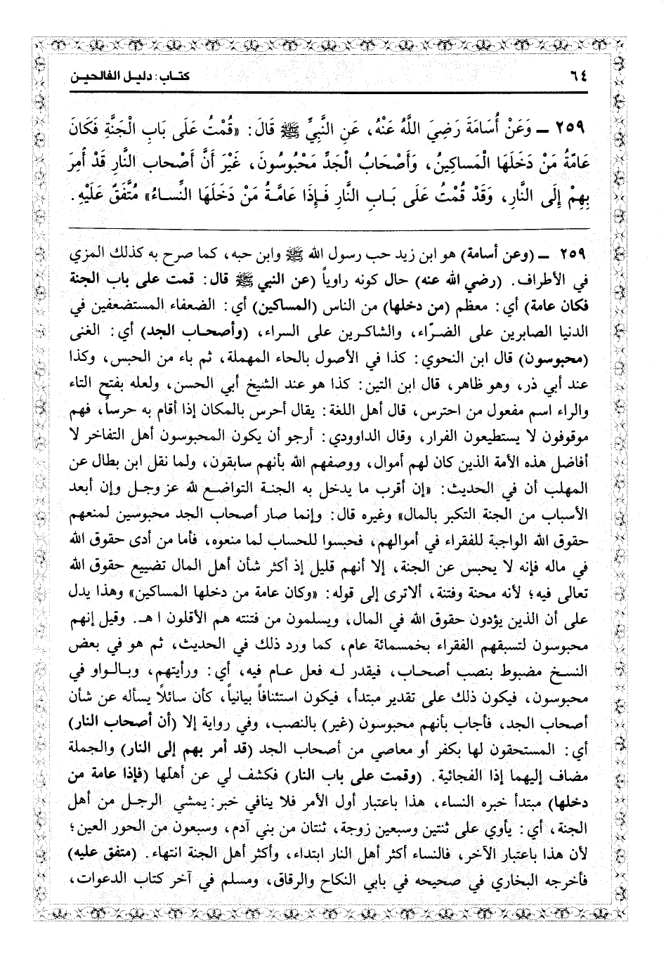 2587 - (وعن أسامة) هو بن زيد حبّ رسول الله - صلى الله عليه وسلم - وابن أخيه كما صرح به كذلك المزي في «الأطراف» (رضي الله عنه) حال كونه راوياً (عن النبي قال: قمت على باب الجنة فكان عامة) أي معظم (من دخلها) من الناس (المساكين) أي الضعفاء المستضعفين في الدنيا الصابرين على الضراء والشاكرين على السراء (وأصحاب الجد) أي الغنى (محبوسون) قال ابن النحوي: كذا في الأصول بالحاء المهملة ثم باء من الحبس، وكذا عند أبي ذرّ وهو ظاهر. قال ابن التين: كذا هو عند الشيخ أبي الحسن ولعله بفتح التاء والراء اسم مفعول من احترس. قال أهل اللغة: يقال أحس بالمكان: إذا قام به حرساً فهم موقوفون لا يستطيعون الفرار. وقال الداوودي: أرجو أن يكون المحبوسون أهل التفاخر لا أفاضل هذه الأمة الذين كان لهم أموال ووصفهم الله بأنهم سابقون. ولما نقل ابن بطال عن المهلب أن في الحديث «إن أقرب ما يدخل به الجنة التواضع عز وجل، وإن أبعد الأسباب من الجنة التكبر بالمال وغيره» قال: وإنما صار أصحاب الجد محبوسون لمنعهم حقوق الله الواجبة للفقراء في أموالهم فحبسوا للحساب لما منعوه، فأما من أدى حقوق الله في ماله فإنه لا يحبس عن الجنة إلا أنهم قليل إذا أكثر شأن أهل المال تضييع حقوق الله تعالى فيه لأنه محنة وفتنة ألا ترى إلى قوله: «وكان عامة من دخلها المساكين وهذا يدل على أن الذين يؤدون حقوق الله في المال ويسلمون من فتنة هم الأقلون اهـ. وقيل إنهم محبوسون لتسبقهم الفقراء بخمسمائة عام كما ورد ذلك في الحديث، ثم هو في بعض النسخ مضبوط بنصب أصحاب فيقدر له فعل عام فيه: أي ورأيهم وبالواو في محبوسون فيكون ذلك على تقدير مبتدأ فيكون استئنافاً بيانياً، كأن سائلاً يسأله عن شأن أصحاب الجد فأجاب بأنهم محبوسون (غير) بالنصب وفي رواية إلا (أن أصحاب النار) أي المستحقون لها بكفر أو معاصي من أصحاب الجد (قد أمر بهم إلى النار) والجملة مضاف إليها إذا الفجائية