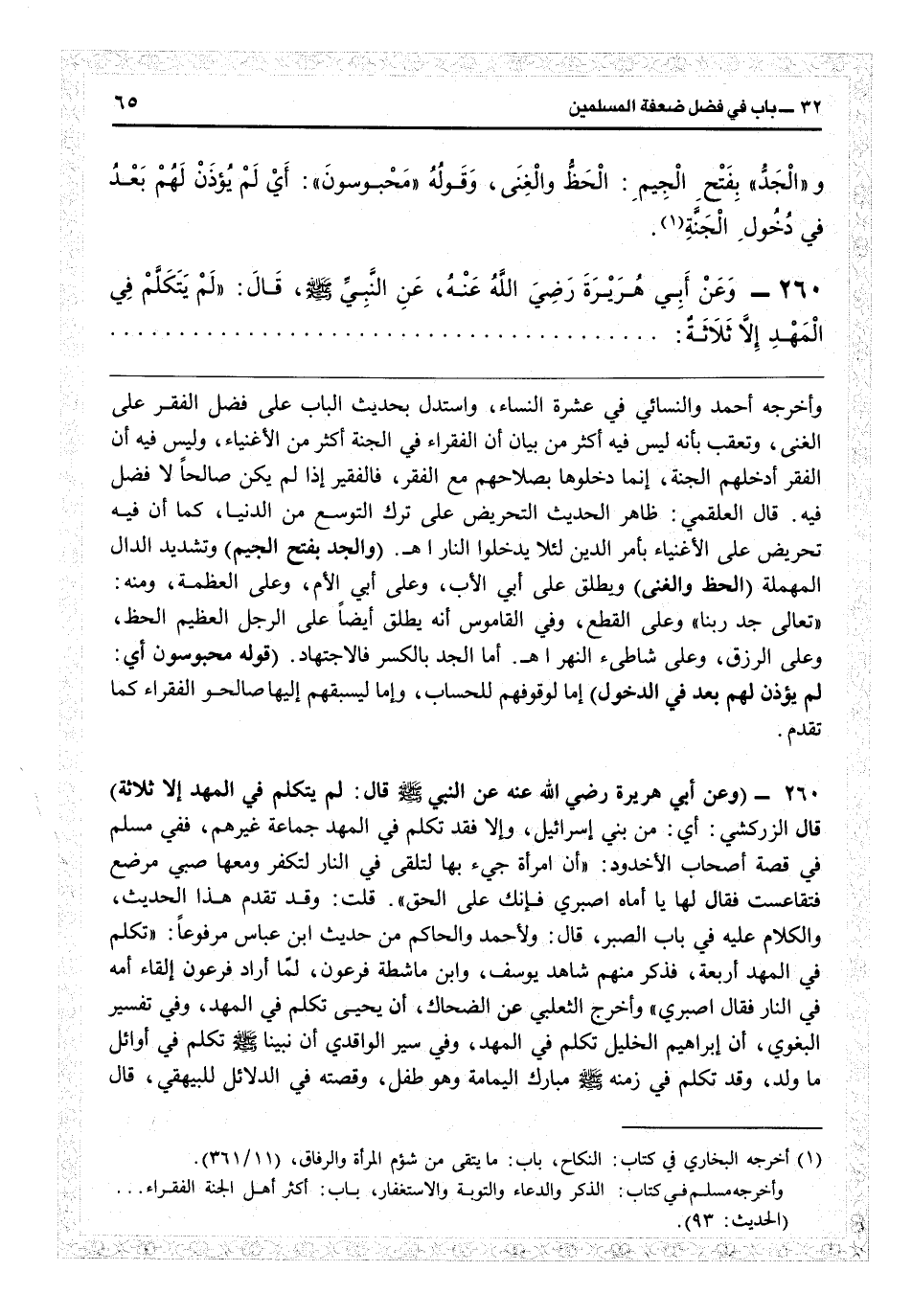 2588 - (وعن أبي هريرة رضي الله عنه عن النبي قال: لم يتكلم في المهد إلا ثلاثة) قال الزركشي: أي من بني إسرائيل، وإلا فقد تكلم في المهد جماعة غيرهم ففي مسلم في قصة أصحاب الأخدود «أن امرأة جيء بها لتلقى في النار لتكفر ومعها صبيّ مرضع فتقاعست، فقال: يا أماه اصبري فإنك على الحق» قلت: وقد تقدم الحديث والكلام عليه في باب الصبر قال: ولأحمد والحاكم من حديث ابن عباس مرفوعاً: «تكلم في المهد أربعة، فذكر منهم شاهد يوسف وابن ماشطة فرعون لما أراد فرعون إلقاء أمه في النار فقال اصبري» . وأخرج الثعلبي عن الضحاك أن يحيى تكلم في المهد، وفي تفسير البغوي أن إبراهيم الخليل تكلم في المهد، وفي سير الواقدي أن نبينا تكلم في أوائل ما ولد. وقد تكلم في زمنه مبارك اليمامة وهو طفل وقصته في الدلائل للبيهقي. قال