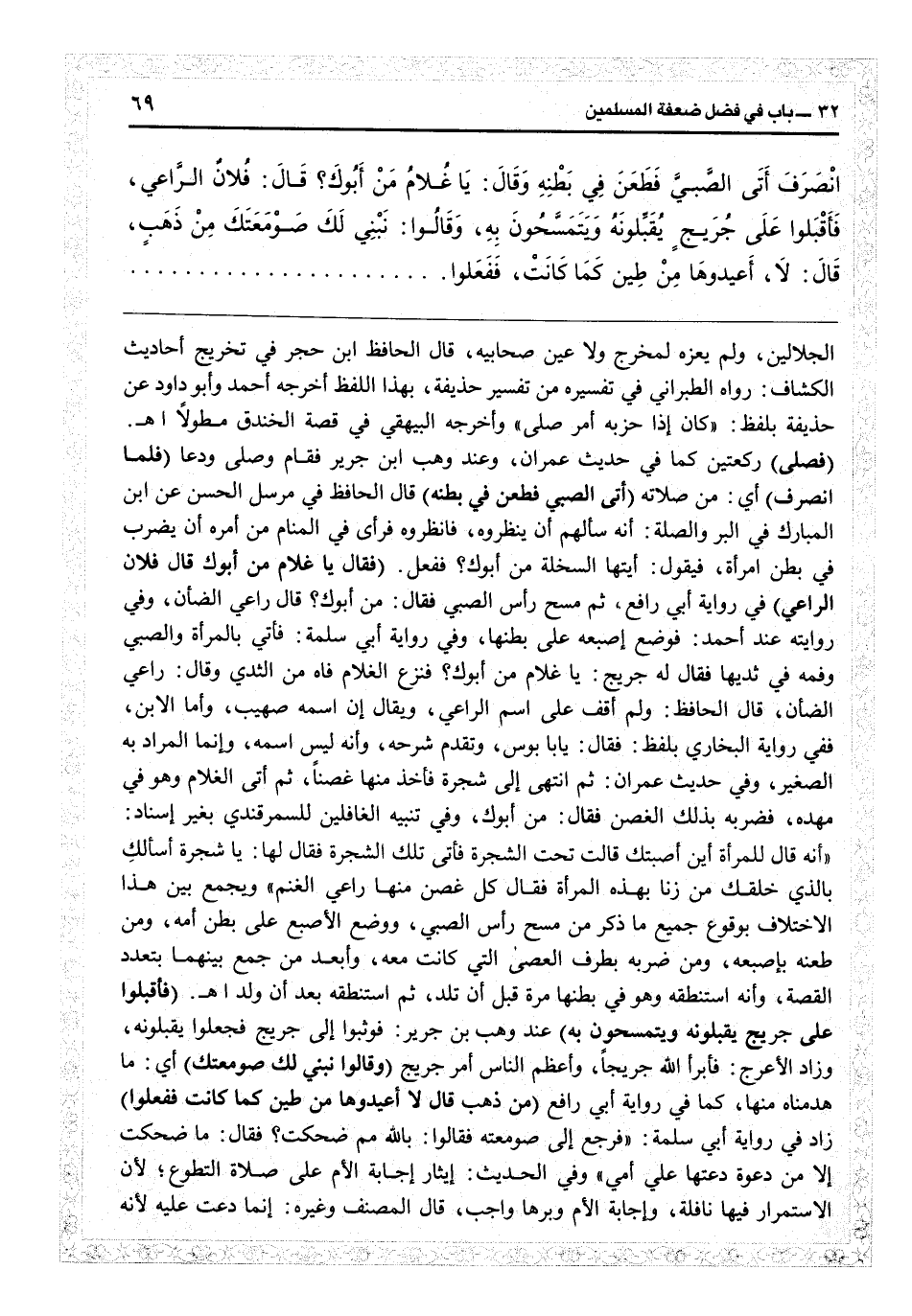 الجلالين ولم يعزه لمخرج ولا عين صحابيه. قال الحافظ ابن حجر في تخريج أحاديث «الكشاف» : رواه الطبراني في «تفسيره» من تفسير حذيفة بهذا اللفظ أخرجه أحمد وأبو داود عن حذيفة بلفظ «كان إذا حزبه أمر صلى» وأخرجه البيهقي في قصة الخندق مطولاً اهـ. (فصلى) ركعتين كما في حديث عمران وعند وهب بن جرير فقام وصلى ودعا (فلما انصرف) أي من صلاته (أتى الصبي فطعن في بطنه) قال الحافظ في مرسل الحسن عن ابن المبارك في البرّ والصلة أنه سألهم أن ينظروه فأنظروه فرأى في المنام من أمره أن يضرب في بطن امرأة فيقول أيتها السخلة من أبوك؟ ففعل (فقال: يا غلام من أبوك؟ قال: فلان الراعي) في رواية أبي رافع «ثم مسح رأس الصبي فقال: من أبوك؟ قال: راعي الضأن» وفي روايته عند أحمد «فوضع أصبعه على