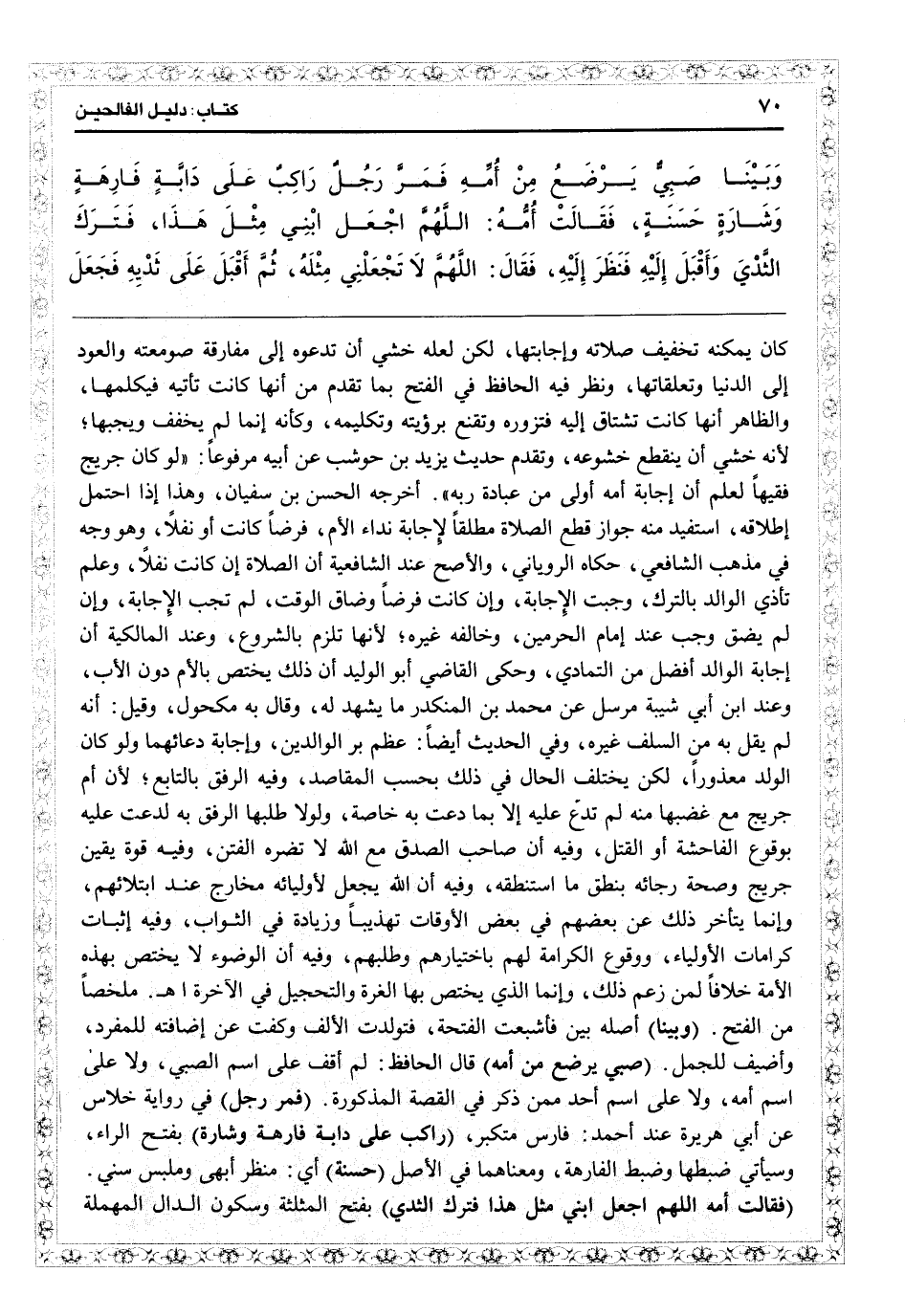 أولى من عبادة ربه» أخرجه الحسن بن سفيان. وهذا إذا احتمل إطلاقه استفيد منه إجابة أمه أولى من عبادة ربه» أخرجه الحسن بن سفيان. وهذا إذا احتمل إطلاقه استفيد منه جواز قطع الصلاة مطلقاً لإجابة نداء الأم فرضاً كانت أو نفلاً، وهو وجه في مذهب الشافعي حكاه الروياني. والأصح عند الشافعية أن الصلاة إن كانت نفلاً وعلم تأذى الوالد بالترك وجبت الإجابة وإن كانت فرضاً وضاق الوقت لم تجب الإجابة وإن لم يضق وجب عند إمام الحرمين وخالفه غيره لأنها تلزم بالشروع. وعند المالكية أن إجابة الوالد أفضل من التمادي. وحكى القاضي أبو الوليد أن ذلك يختص بالأم دون الأب. وعند ابن أبي شيبة مرسل عن محمد بن المنكدر ما يشهد له، وقال به مكحول. وقيل إنه لم يقل به من السلف غيره. وفي الحديث أيضاً عظم برّ الوالدين وإجابة دعائهما ولو كان الولد معذوراً لكن يختلف الحال في ذلك بحسب المقاصد. وفيه الرفق بالتابع لأن أم جريج مع غضبها منه لم تدع عليه إلا بما دعت به خاصة، ولولا طلبها الرفق بالتابع لأن أم جريج مع غضبها منه لم تدع عليه إلا بما دعت به مع الله لا تضرّه الفتن. وفيه قوّة يقين جريج وصحة رجائه بنطق ما استنطقه، وفيه أن الله يجعل لأوليائه مخارج عند ابتلائهم وإنما يتأخر ذلك عن بعضهم في بعض الأوقات تهذيباً وزيادة في الثواب، وفيه إثبات كرامات الأولياء ووقوع الكرامة لهم باختيارهم وطلبهم، وفيه أن الوضوء لا يختص بهذه الأمة خلافاً لمن زعم ذلك وإنما الذي يختص بها الغرّة والتحيل في الآخرة اهـ. ملخصاً من «الفتح» (وبينما) أصله بين فأشبعت الفتحة فتولدت الألف وكفت عن اضافته للمفرد وأضيف للجمل (صبي يرضع من أمه) قال الحافظ: لم أقف على اسم الصبيّ ولا على اسم أمه ولا على اسم أحد ممن ذكر في القصة المذكورة (فمر رجل) في رواية خلاس عن أبي هريرة عند أحمد «فارس متكبر» (راكب على دابة فارهة وشارة) بفتح الراء وسيأتي ضبطها وضبط الفارهة ومعناهما