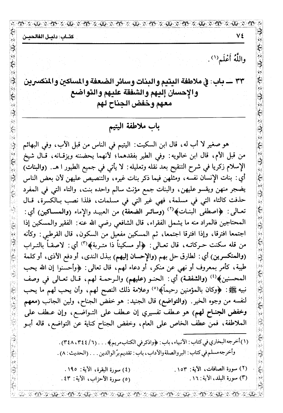 هو صغير لا أب له. قال ابن السكيت: اليتيم في الناس من قبل الأب وفي البهائم من قبل الأم. قال ابن خالويه: وفي الطير بفقدهما لأنهما يحضنانه ويرزقانه. قال شيخ الإسلام زكريا في «شرح التنقيح» بعد نقله وتعليله: لا يأتي في جميع الطيور اهـ. (والبنات) أي بنات الإنسان نفسه ومثلهن فيما ذكر بنات غيره والتنصيص عليهن لأن بعض الناس يضجر منهن ويقسو عليهن والبنات جمع مؤنث سالم واحده بنت والتاء التي في المفرد حذفت كالتاء التي في مسلمة فهي غير التي في مسلمات فلذا نصب بالكسرة قال تعالى: {أصطفى البنات} (الصافات: 153) (وسائر الضعفة) من العبيد والإماء (والمساكين) أي المحتاجين فالمراد منه ما يشمل الفقراء قال الشافعي رضي الله عنه: الفقير والمسكين إذا اجتمعا افترقا، وإذا افترقا اجتمعا. ثم المسكين مفعيل من الكسون. قال القرطبي: وكأنه من قلة سكنت حركاته، قال تعالى: {أو مسكيناً ذا متربة} (البلد: 16) أي لاصقاً بالتراب (والمنكسرين) أي لطارق حل بهم (والإحسان إليهم) ببذل الندى أو دفع الأذى أو كلمة طيبة: كأمر بمعروف أو نهي عن منكر أو دعاء لهم قال تعالى: {وأحسنوا إن الله يحب المحسنين} (البقرة: 195) (والشفقة) أي الحنوّ (عليهم) والرحمة لهم، قال تعالى في وصف نبيه: {وكان بالمؤمنين رحيماً} (الأحزاب: 43) وعلامة ذلك النصح لهم وأن يحبّ لهم ما يحبّ لنفسه من وجوه الخير (والتواضع) قال الجنيد: هو خفض الجناح ولين الجانب (معهم وخفض الجناح لهم) هو عطف تفسيري إن عطف على التواضع وإن عطف على الملاطفة فمن عطف الخاص على العام، وخفض الجناح كناية عن التواضع قاله أبو