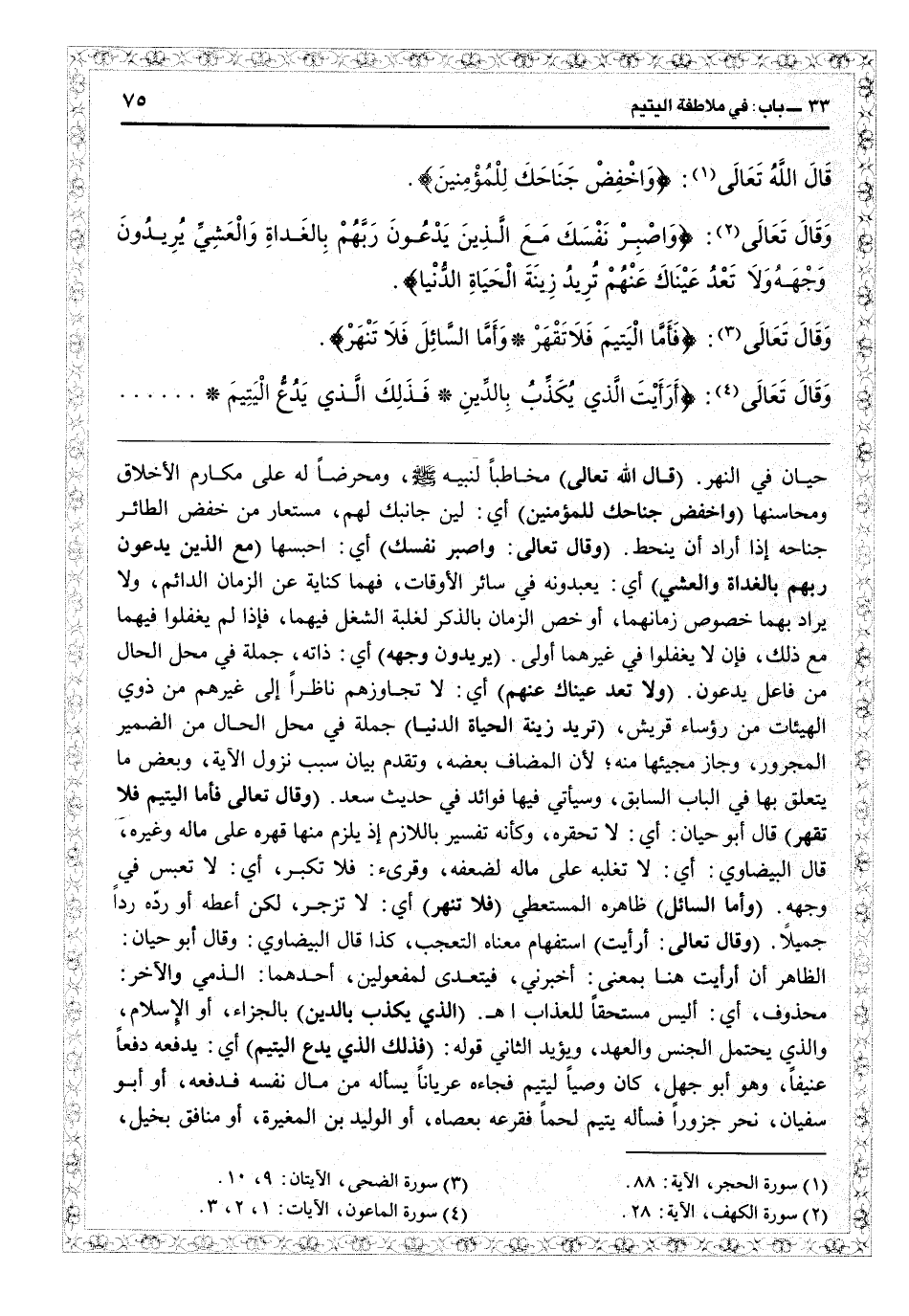 (وقال تعالى: {فأما اليتيم فلا تقهر} ) قال أبو حيان: أي لا تحقره وكأنه تفسير باللازم إذ يلزم منها قهره على ماله وغيره. قال البيضاوي: أي لا تغلبه على ماله لضعفه. وقرىء: «فلا تكهر» أي لا تعبس في وجهه ( {وأما السائل} ) ظاهره المستعطي ( {فلا تنهر} ) أي لا تزجره لكن أعطه أورده رداً جميلاً.
