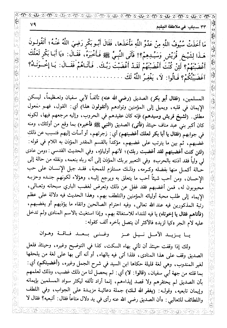 القدسي «ومن عادى لي ولياً، فقد آذنته بالحرب» وفي التعبير بربك المؤذن إلى أنه رباه بنعمه ونقله من حالة إلى حالة أكمل منها بفضله وكرمه، وذلك مستلزم للمحبة فقد جبل الإنسان على حب الإحسان، ومن أحبّ شيئاً أحبّ ما يتعلق به ويرجع إليه وهؤلاء لكونهم جنده وحزبه محبوبون له، فمن أغضبهم فقد غفل عن ذلك وتعرض لغضب الباري سبحانه وتعالى، الإيماء إلى طلب محبة أوليائه المؤمنين والتلطف بهم. وهذا الحديث فيه دلالة على عظم رتبة المذكورين فيه عند الله تعالى، وفيه احترام الصالحين واتقاء ما يؤذيهم أو يغضبهم (فأتاهم فقال: يا إخوتاه) يا فيه للنداء للاستغاثة بهم، وإذا استغيث بالاسم المنادى ولم تدخل عليه لام الجر كيا لزيد فالأكثر أن يتصل بآخره ألف كقوله: