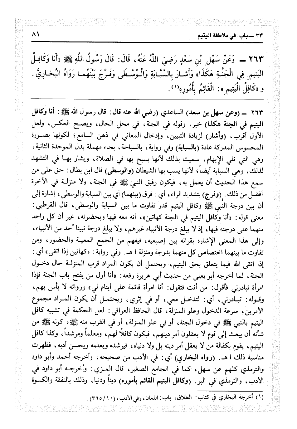 2623 - (وعن سهل بن سعد) الساعدي (رضي الله عنه قال: قال رسول الله: أنا وكافل اليتيم في الجنة هكذا) خبر، وقوله في الجنة في محل الحال ويصح العكس، ولعل الأول أقرب (وأشار) لزيادة التبيين وإدخال المعاني في ذهن السامع لكونها بصورة المحسوس المدركة عادة (بالسبابة) . وفي رواية بالسباحة بحاء مهملة بدل الموحدة الثانية وهي التي تلي الإبهام، سميت بذلك لأنها يسبح بها في الصلاة ويشار بها في التشهد لذلك وهي السبابة أيضاً لأنها يسب بها الشيطان (والوسطى) قال ابن بطال: حق على من سمع هذا الحديث أن يعمل به فيكون رفيق النبي في الجنة ولا منزلة في الآخرة أفضل من ذلك (وفرج) بتشديد الراء أي فرق (بينهما) أي بين السبابة والوسطى إشارة إلى أن بيت درجة النبي وكافل اليتيم قدر تفاوت ما بين السبابة والوسطى. قال القرطبي معنى قوله: «أنا وكافل اليتيم في الجنة كهاتين» أنه معه فيها وبحضرته غير أن كل واحد منهما على درجته فيها إذ لا يبلغ درجة الأنبياء غيرهم ولا يبلغ درجة نبينا أحد من الأنبياء وإلى هذا المعنى الإشارة بقرانه بين أصبعيه فيفهم من الجمع المعية والحضور ومن تفاوت ما بينهما اختصاص كل منهما بدرجة ومنزلة اهـ.