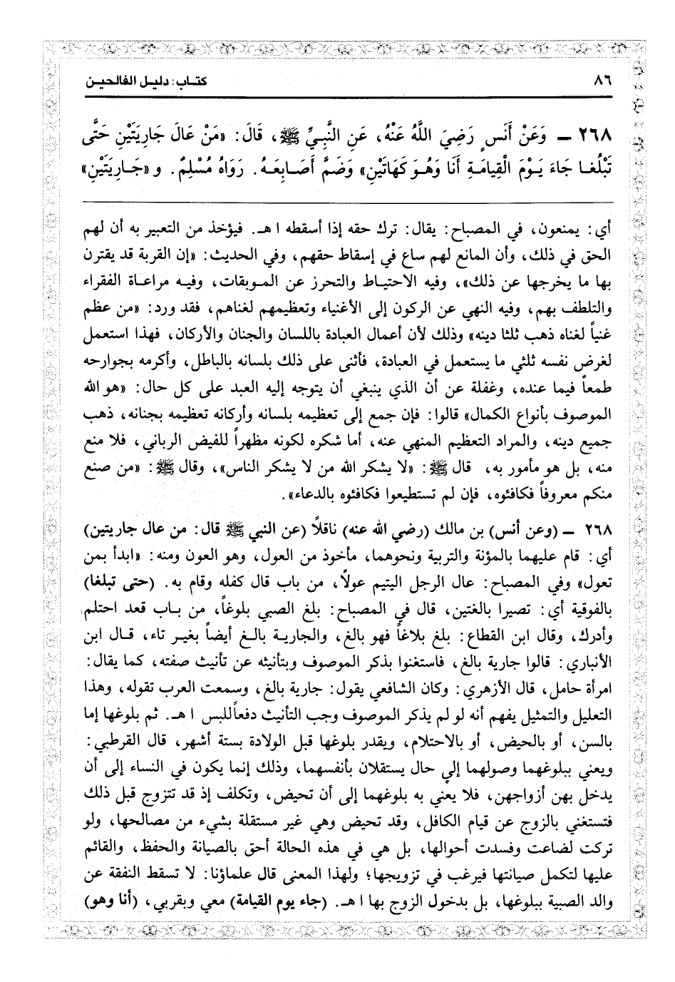 2678 - (وعن أنس) بن مالك (رضي الله عنه) ناقلاً (عن النبي قال: من عال جاريتين) أي قام عليهما بالمؤنة والتربية ونحوهما مأخوذ من العول وهو العون ومنه: «ابدأ بمن تعول» وفي «المصباح» : عال الرجل اليتيم عولاً من باب قال كفله وقام به (حتى تبلغا) بالفوقية أي تصيرا بالغتين. قال في «المصباح» : بلغ الصبي بلوغاً من باب قعد: احتلم وأدرك، وقال ابن القطاع: بلغ بلاغاً فهو بالغ والجارية بالغ أيضاً بغير تاء، قال ابن الأنباري يقال جارية بالغ فاستغنوا بذكر الموصوف وبتأنيثه عن تأنيث صفته كما يقال امرأة حامل، قال الأزهري: وكان الشافعي يقول جارية بالغ وسمعت العرب تقوله، وهذا التعليل والتمثيل يفهم أنه لو لم يذكر الموصوف وجب التأنيف دفعاً للبس اهـ. ثم بلوغها إما بالسن أو بالحيض أو بالاحتلام ويقدر بلوغها قبل الولادة بستة أشهر، قال القرطبي ويعني ببلوغهما وصولهما إلى حال يستقلان بأنفسهما وذلك إنما يكون في النساء إلى أن يدخل بهن أزواجهن فلا يعني به بلوغهما إلى أن تحيض وتكلف إذ قد تتزوج قبل ذلك فتستغني بالزوج عن قيام الكافل، وقد تحيض وهي غير مستقلة بشيء من مصالحها ولو تركت لضاعت وفسدت أحوالها، بل هي في هذه الحالة أحق بالصيانة والحفظ والقائم عليها لتكمل صيانتها فيرغب في تزويجها ولهذا المعنى قال علماؤنا لا تسقط النفقة عن والد الصبية ببلوغها بل بدخول الزوج بها اهـ. (جاء يوم القيامة) معي وبقربي (أنا وهو)