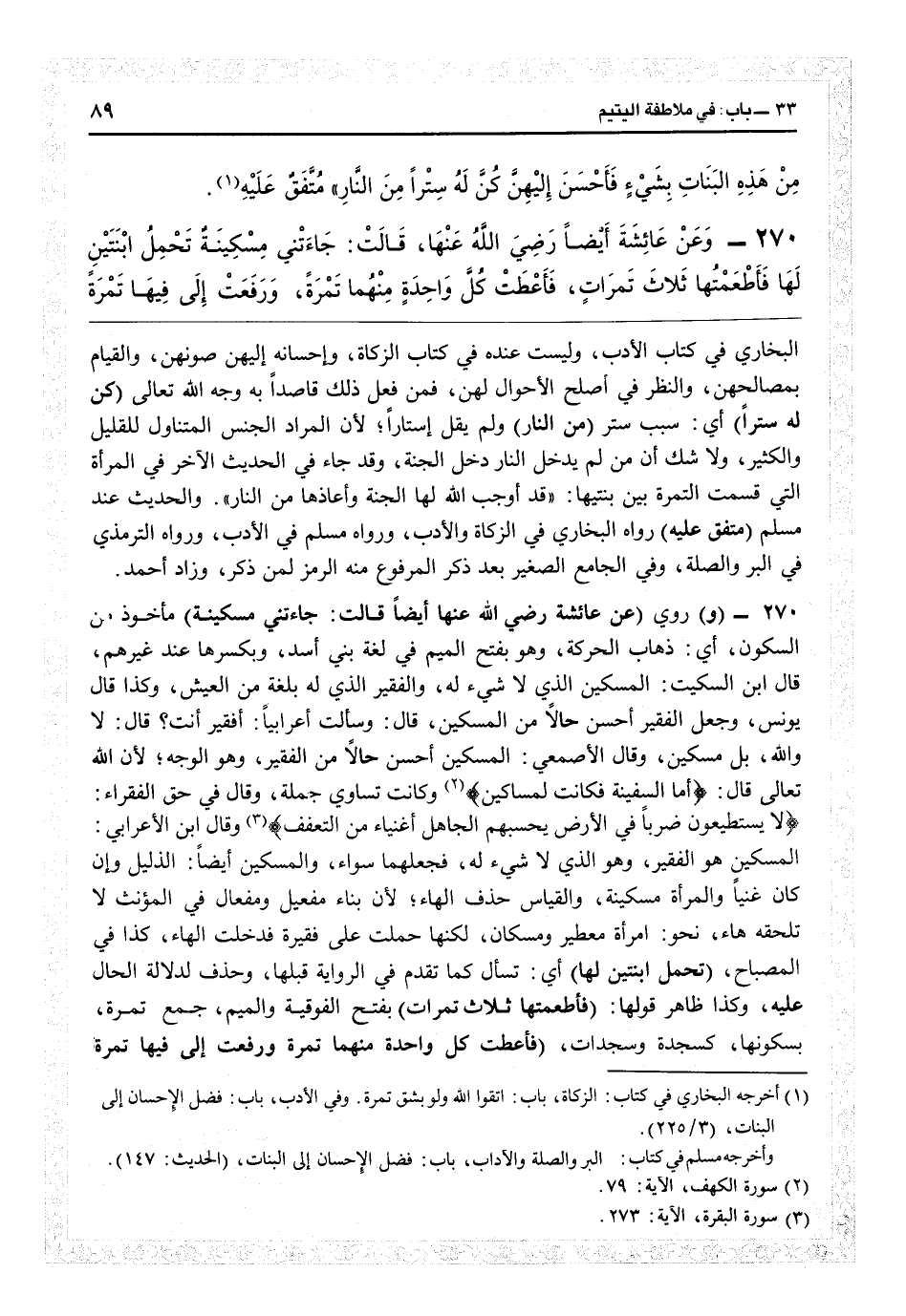 البخاري في كتاب الأدب وليست عنده في كتاب الزكاة، وإحسانه إليهن: صونهن والقيام بمصالحهن والنظر في أصلح الأحوال لهن، فمن فعل ذلك قاصداً به وجه الله تعالى: (كنّ له ستراً) أي سبب ستر (من النار) ولم يقل أستاراً لأن المراد الجنس المتناول للقليل والكثير، ولا شك أن من لم يدخل النار دخل الجنة، وقد جاء في الحديث الآخر في المرأة التي قسمت التمرة بين بنتيها «قد أوجب الله لها الجنة وأعاذها من النار» والحديث عند مسلم (متفق عليه) رواه البخاري في الزكاة والأدب، ورواه مسلم في الأدب، ورواه الترمذي في البرّ والصلة وفي «الجامع الصغير» بعد ذكر المرفوع منه الرمز لمن ذكر وزاد أحمد.