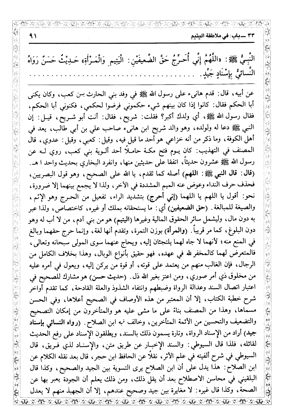 عن أبيه قال: قدم هانىء على رسول الله في وفد بني الحارث بن كعب وكان يكنى أبا الحكم فقال: كانوا إذا كان بينهم شيء حكموني فرضوا لحكمي فكنوني أبا الحكم فقال رسول الله - صلى الله عليه وسلم - أيّ ولدك أكبر؟ فقلت: شريح؟ فقال: أنت أبو شريح. قيل إن النبي دعا له ولولده وهو والد شريح بن هانىء صاحب علي بن أبي طالب يعد في أهل الكوفة، وما ذكر من أنه خزاعي هو أحد ما قيل فيه. قيل كعبيّ، وقيل عدوي قال المصنف في «التهذيب» : كان يوم فتح مكة حاملاً أحد ألوية بني كعب، روي له عن رسول الله - صلى الله عليه وسلم - عشرون حديثاً، اتفقا على حديثين منها، وانفرد البخاري بحديث واحد اهـ. (قال قال رسول الله: اللهم) أصله كما تقدم يا أعلى الصحيح وهو قول البصريين، فحذف حرف النداء وعوض عنه الميم المشددة في الآخر، ولذا لا يجمع بينهما إلا ضرورة نحو: أقول يا اللهم يا اللهما (إني أحرّج) بتشديد الراء تفعيل من الحرج: وهو الإثم والصيغة للمبالغة (حق الضعيفين) أي ما يستحقانه بملك أو غيره كاختصاص ولذا عبر به دون مال وليشمل سائر الحقوق المالية وغيرها (اليتيم) هو من بني آدم من لا أب له وهو دون البلوغ كما مرّ قريباً (والمرأة) بوزن التمرة، وتقدم أنها لغة، وإنما حرّج حقهما وبالغ في المنع منه لأنهما