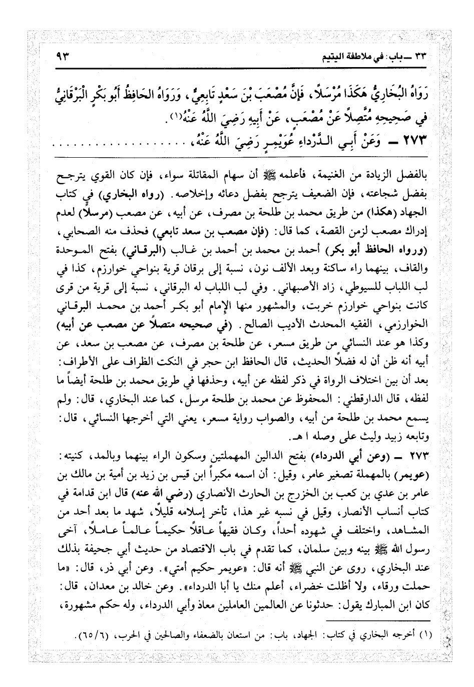 نون نسبة إلى برقان: قرية بنواحي خوارزم كذا في «اللباب» للسيوطي، زاد الأصبهاني: وفي «لب اللباب» له البرقاني نسبة إلى قرية من قرى كانت بنواحي خوارزم خربت، والمشهور منها الإمام أبو بكر أحمد بن محمد البرقاني الخوارزمي الفقيه المحدث الأديب الصالح (في صحيحه متصلاً عن مصعب عن أبيه) وكذا هو عند النسائي من طريق مسعر عن طلحة بن مصرف عن مصعب بن سعد عن أبيه أنه ظن أن له فضلاً الحديث. قال الحافظ ابن حجر في «النكت الظراف على الأطراف» بعد أن بين اختلاف الرواة في ذكر لفظة «عن أبيه» وحذفها في طريق محمد بن طلحة أيضاً ما لفظه: قال الدارقطني: المحفوظ عن محمد بن طلحة مرسل كما عند البخاري، قال: ولم يسمع محمد بن طلحة من أبيه، والصواب رواية مسعر، يعني التي أخرجها النسائي، قال: وتابعه زبيد وليث على وصله اهـ.