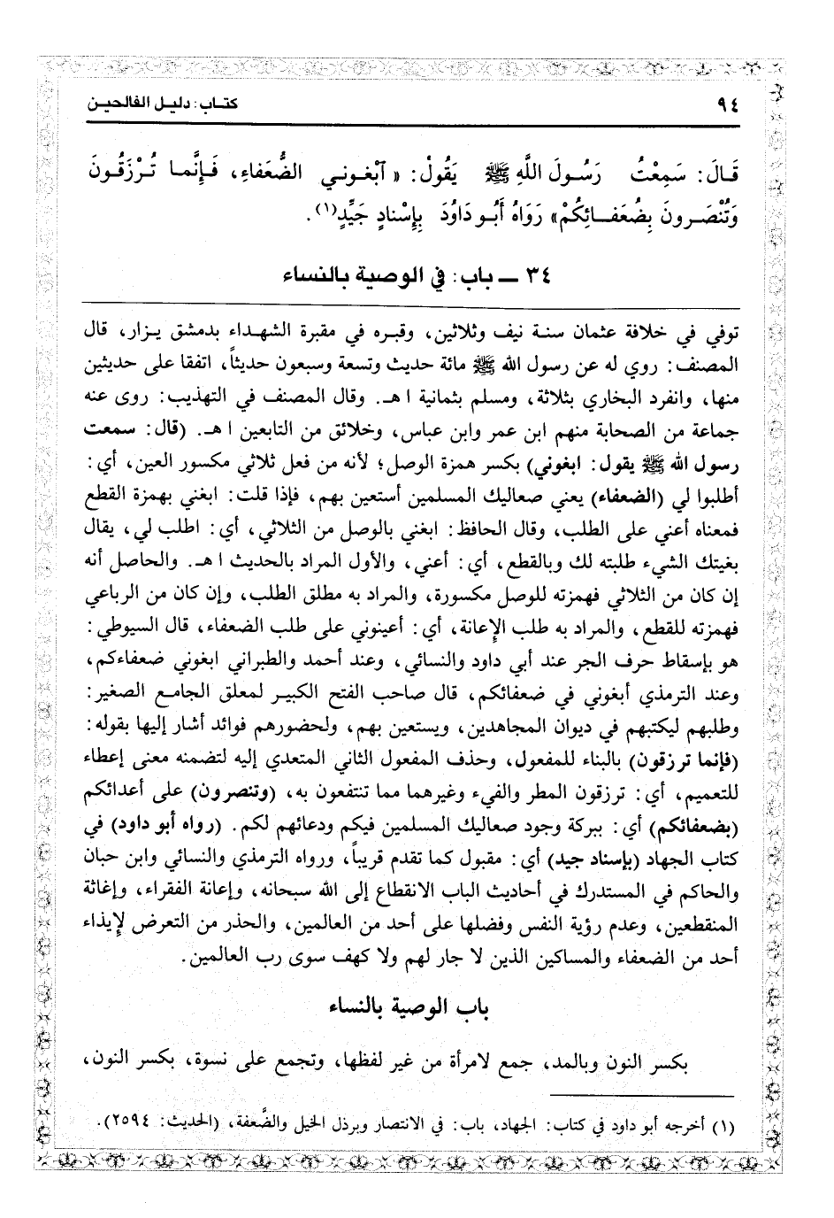 (قال: سمعت رسول الله - صلى الله عليه وسلم - يقول: ابغوني) بكسر همزة الوصل لأنه من فعل ثلاثي مكسور العين: أي اطلبوا لي (الضعفاء) يعني صعاليك المسلمين أستعين بهم فإذا قلت: أبغني بهمزة القطع فمعناه أعني على الطلب. وقال الحافظ: ابغني بالوصل من الثلاثي أي اطلب لي، يقال بغيتك الشيء: طلبته لك، وبالقطع: أي أعني والأول المراد بالحديث اهـ. والحاصل أنه إن كان من الثلاثي فهمزته للوصل مكسورة والمراد به مطلق الطلب، وإن كان من الرباعي فهمزته للقطع والمراد به طلب الإعانة: أي أعينوني على طلب الضعفاء. قال السيوطي: هو بإسقاط حرف الجرّ عند أبي داود والنسائي، وعند أحمد والطبراني «ابغوني ضعفاءكم» وعن الترمذي «ابغوني في ضعفائكم» قال صاحب «الفتح الكبير» لمعلق «الجامع الصغير» : وطلبهم ليكتبهم في ديوان المجاهدين ويستعين بهم. ولحضورهم فوائد أشار إليها بقوله: (فإنما ترزقون) بالبناء للمفعول وحذف المفعول الثاني المتعدى إليه لتضمنه معنى إعطاء للتعميم: أي ترزقون المطر والفيء وغيرهما مما تنتفعون به (وتنصرون) على أعدائكم (بضعفائكم) أي ببركة وجود صعاليك المسلمين فيكم ودعائهم لكم (رواه أبو داود) في كتاب الجهاد (بإسناد جيد) أي مقبول كما تقدم قريباً/ رواه الترمذي والنسائي وابن حبان والحاكم في «المستدرك» وفي أحاديث الباب والانقطاع إلى الله سبحانه وإعانة الفقراء وإغاثة المنقطعين وعدم رؤية النفس وفضلها على أحد من العاملين والحذر من التعرض لإيذاء أحد من الضعفاء والمساكين الذين لا جار لهم ولا كهف سوى ربّ العالمين.d