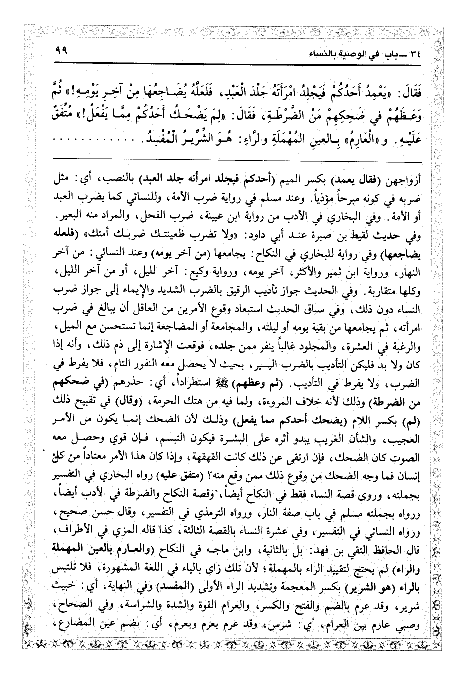 وفي رواية البخاري في النكاح «يجامعها» (من آخر يومه) وعند النسائي «من آخر النهار» ورواية ابن نمير والأكثر «آخر يومه» ورواية وكيع «آخر الليل أو من آخر الليل» وكلها متقاربة وفي الحديث جواز تأديب الرقيق بالضرب الشديد، والإيماء إلى جواز ضرب النساء دون ذلك، وفي سياق الحديث استبعاد وقوع الأمرين من العاقل أن يبالغ في ضرب امرأته ثم يجامعها من بقية يومه أو ليلته، والمجامعة أو المضاجعة إنما تستحسن مع الميل والرغبة في العشرة والمجلود غالباً ينفر ممن جلده، فوقعت الإشارة إلى ذم ذلك، وأنه إذا كان ولا بد فليكن التأديب بالضرب اليسير بحيث لا يحصل معه النفور التام فلا يفرط في الضرب ولا يفرط في التأديب (ثم وعظهم) استطراداً: أي حذرهم (في ضحكهم من الضرطة) وذلك لأنه خلاف المروءة، ولما فيه من هتك الحرمة (وقال) في تقبيح ذلك (لم) بكسر اللام (يضحك أحدكم مما يفعل) وذلك لأن الضحك إنما يكون من الأمر العجيب والشأن الغريب يبدو أثره على البشرة فيكون التبسم، فإن قوي وحصل معه الصوت كان الضحك، فإن ارتقى على ذلك كانت القهقهة، وإذا كان هذا الأمر معتاداً من كل إنسان فما وجه الضحك من وقوع ذلك ممن وقع منه (متفق عليه) رواه البخاري في التفسير بجملته، وروى قصة النساء فقط في النكاح أيضاً، وقصة النكاح والضرطة في الأدب أيضاً، ورواه بجملته مسلم في باب صفة النار، ورواه الترمذي في «التفسير» وقال: حسن صحيح، ورواه النسائي في «التفسير» وفي عشرة النساء بالقصة الثالثة، كذا قاله المزي في «الأطراف» . قال الحافظ التقي ابن فهد: بل الثانية وابن ماجه في النكاح (والعارم بالعين المهملة والراء) لم يحتج لتقييد الراء بالمهملة لأن تلك زاي بالياء في اللغة المشهورة فلا تلتبس بالراء (هو الشرير) بكسر المعجمة وتشديد الراء الأولى (المفسد) . وفي «النهاية» ، أي خبيث شرير وقد عرم بالضم والفتح والكسر، والعرام: القوة والشدة والشراسة. وفي «الصحاح» :