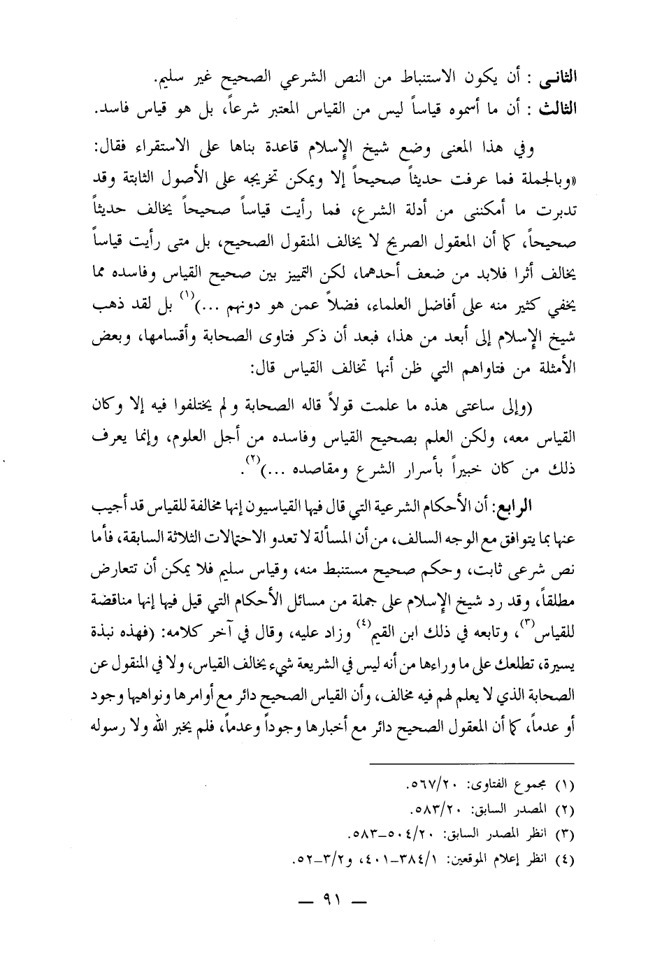 الرابع: أن الأحكام الشرعية التي قال فيها القياسيون أنها مخالفة للقياس قد أجيب عنها بما يتوافق مع الوجه السالف، مع أن المسألة لا تعدو الاحتمالات الثلاثة السابقة، فإنما نص شرعي ثابت، وحكم صحيح مستنبط منه، وقياس سليم فلا يمكن أن تتعارض مطلقاً، وقد رد شيخ الإسلام على جملة من مسائل الأحكام التي قيل فيها أنها مناقضة للقياس، وتابعه في ذلك ابن القيم وزاد عليه، وقال في آخر كلامه: (فهذه نبذه يسيرة تطلعك على ما وراءها من أنه ليس في الشريعة شيء يخالف القياس، ولا في المنقول عن الصحابة الذي لا يعلم لهم فيه مخالف، وأن القياس الصحيح دائر مع أوامرها ونواهيها وجود أو عدماً، كما أن المعقول الصحيح دائر مع أخبارها وجوداً وعدماً، فلم يخبر الله ولا رسوله