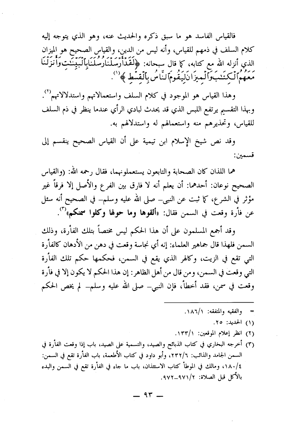 فالقياس الفاسد هو ما سبق ذكره والحديث عنه، وهو الذي يتوجه إليه كلام السلف في ذمهم للقياس، وأنه ليس من الدين، والقياس الصحيح هو الميزان الذي أنزله الله مع كتابه، كما قال سبحانه: [لقد أرسلنا رسلنا بالبينات وأنزلنا معهم الكتاب والميزان ليقوم الناس بالقسط] .