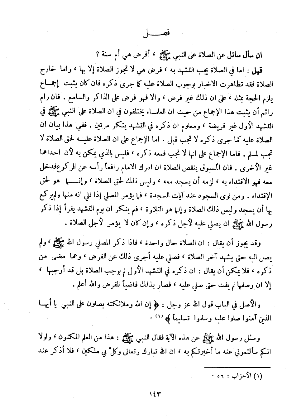 قيل: أما في الصلاة يجب التشهد به، فرض هي لا تجوز الصلاة إلا بها، وإما خارج الصلاة فقد تظاهرت الأخبار بوجوب الصلاة عليه كما جرى ذكره فإن كان يثبت إجماع يلزم الحجة بمثله، على أن ذلك غير فرض، وإلا فهو فرض على الذاكر والسامع. فإن رام رائم أن يثبت هذا الإجماع من حيث إن العلماء يختلفون في إن الصلاة على النبي صلى الله عليه وسلم في التشهد الأول غير فريضة، ومعلوم أن ذكره في التشهد يتكر مرتين. ففي هذا بيان إن الصلاة عليه كما جرى ذكره لا تجب قبل. إما الإجماع على أن الصلاة عليه لحق الصلاة لا تجب لمسلم. فإما الإجماع على أنها لا تجب فمعه ذكره، فليس بالذي يمكن به لأن إحداهما غير الأخرى. فإن المسبوق ينقص الصلاة إن أدرك الإمام رافعًا رأسه عن الركوع فدخل معه فهو الاقتداء به، لزمه أن يسجد معه، وليس ذلك لحق الصلاة، وإنما هو لحق الإقتداء. ومن نوى السجود عند آيات السجدة، فما يؤمر المصلي إذا تلي أنه منها ولم يركع بها أن يسجد وليس ذلك الصلاة وإنما هو التلاوة، فلم ينكر إن يوم التشهد يقرأ إذا ذكر رسول الله صلى الله عليه وسلم أن يصلي عليه لأجل ذكره، وإن كان لا يؤمر لأجل الصلاة.