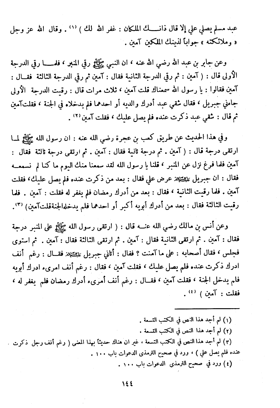 وفي هذا الحديث عن طريق كعب بن عجرة رضي الله عنه: إن رسول الله صلى الله عليه وسلم لما ارتقى درجة قال: (آمين. ثم درجة ثانية فقال: آمين. ثم ارتقى درجة ثالثة فقال: آمين فلما فرغ نزل عن المنبر، قلنا يا رسول الله لقد سمعنا منك اليوم ما كنا لم نسمعه فقال: إن جبريل عليه السلام عرض علي فقال: بعد من ذكرت عنده فلم يصل عليك، فقلت آمين. فلما رقيت الثانية، فقال: بعد من أدرك رمضان فلم يغفر له فقلت: آمين. فلما رقيت الثالثة فقال: بعد من أدرك أبويه أكبر أو أحدهما فلم يدخله الجنة قلت آمين).