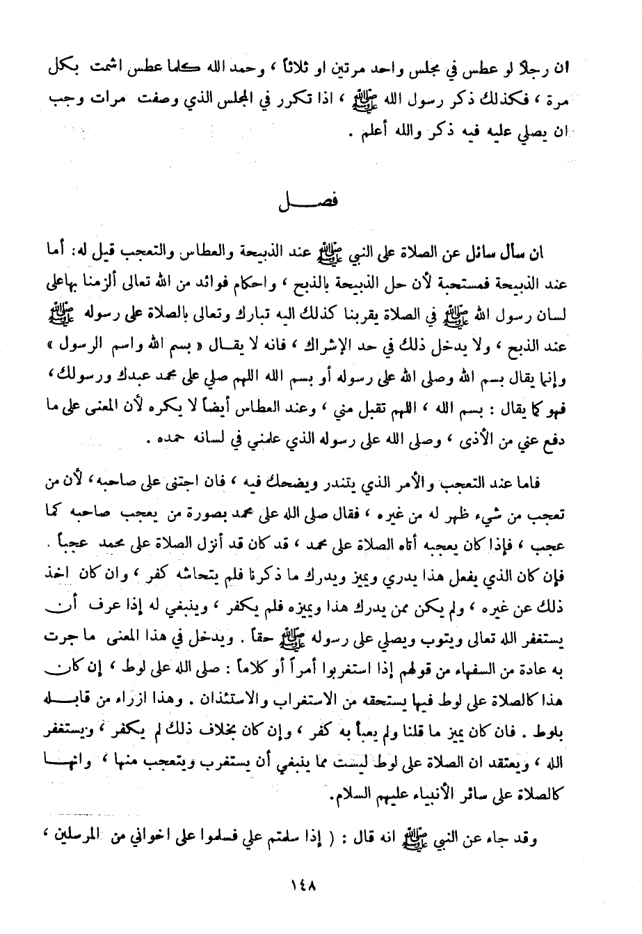 أن سأل سائل عن الصلاة على النبي صلى الله عليه وسلم عند الذبيحة والعطاس والتعجب قيل له: أما عند الذبيحة فمستحبة لأن حل الذبيحة بالذبح، وأحكام فوائد من الله تعالى ألزمنا بها على لسان رسول الله صلى الله عليه وسلم في الصلاة يقربنا كذلك إليه تبارك وتعالى بالصلاة على رسوله صلى الله عليه وسلم عند الذبح، ولا يدخل ذلك في حد الإشراك، فإنه لا يقال "بسم لاله واسم الرسول" وإنما يقال بسم الله وصلى الله على رسوله أو بسم الله اللهم صلي على محمد عبدك ورسولك، فهو كما يقال: بسم الله، اللهم تقبل مني، وعند العطاس أيضًا لا يكره لأن المعنى على ما دفع عني من الأذى، وصلى الله على رسوله الذي علمني في لسانه حمده.