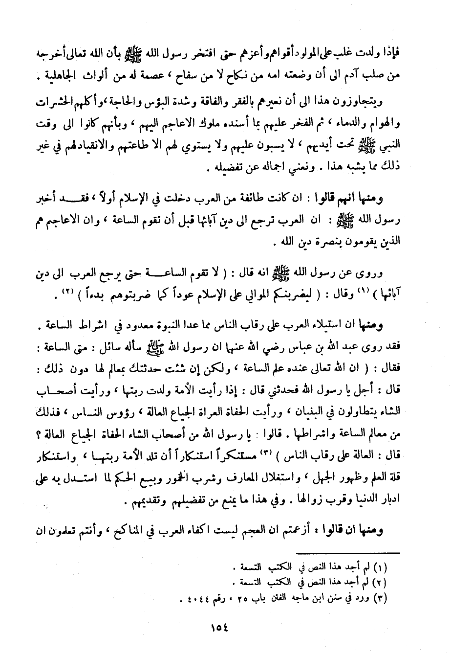 ومنها أن استيلاء العرب على رقاب الناس مما عدا النبوة معدود في اشراط الساعة. فقد روى عبد الله بن عباس رضي الله عنهما أن رسول الله صلى الله عليه وسلم سأله سائل: متى الساعة: فقال: (إن الله تعالى عنده علم الساعة، ولكن إن شئت حدثتك بمعالم لها دون ذلك: قال: أجل يا رسول الله فحدثني قال: إذا رأيت الأمة ولدت ربتها، ورأيت أصحاب الشاء يتطاولون في البنيان، ورأيت الحفاة العراة الجياع العالة، رؤوس الناس، فذلك من معالم الساعة واشراطها. قالوا: يا رسول الله من أصحاب الشاء الحفاة الجياع العالة؟ قال: العالة على رقاب الناس) مستنكرًا استنكارًا أن تلد الأمة ربتها، واستنكار قلة العلم وظهور الجهل، واستغلال المعارف وشرب الخمور وبيع الحكم لما استدل به على أدبار الدنيا وقرب زوالها. وفي هذا ما يمنع من تفضيلهم وتقديمهم.
