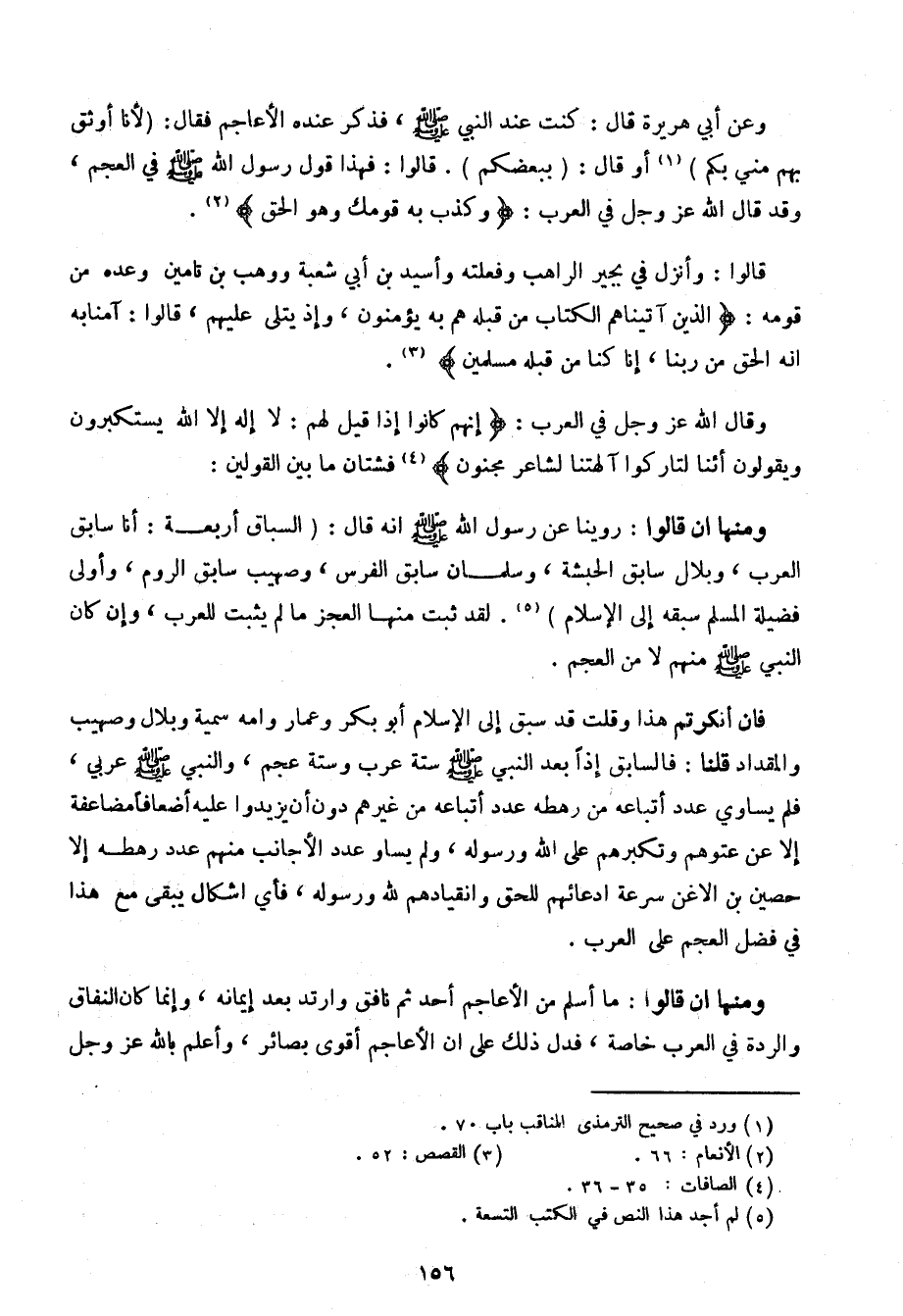 فإن أنكرتم هذا وقلت قد سبق إلى الإسلام أبو بكر وعمار وأمه سمية وبلال وصهيب والمقداد قلنا: فالسابق إذًا بعد النبي صلى الله عليه وسلم ستة عرب وستة عجم، والنبي صلى الله عليه وسلم عربي، فلم يساوي عدد أتباعه من رهطه عدد أتباعه من غيرهم دون أن يزيدوا عليه أضعافًا مضاعفة إلا عن عتوهم وتكبرهم على الله ورسوله، ولم يساو عدد الأجانب منهم عدد رهطه إلا حصين بن الأغن سرعة إدعائهم للحق وانقيادهم لله ورسوله، فأي أشكال يبقى مع هذا في فضل العجم على العرب.