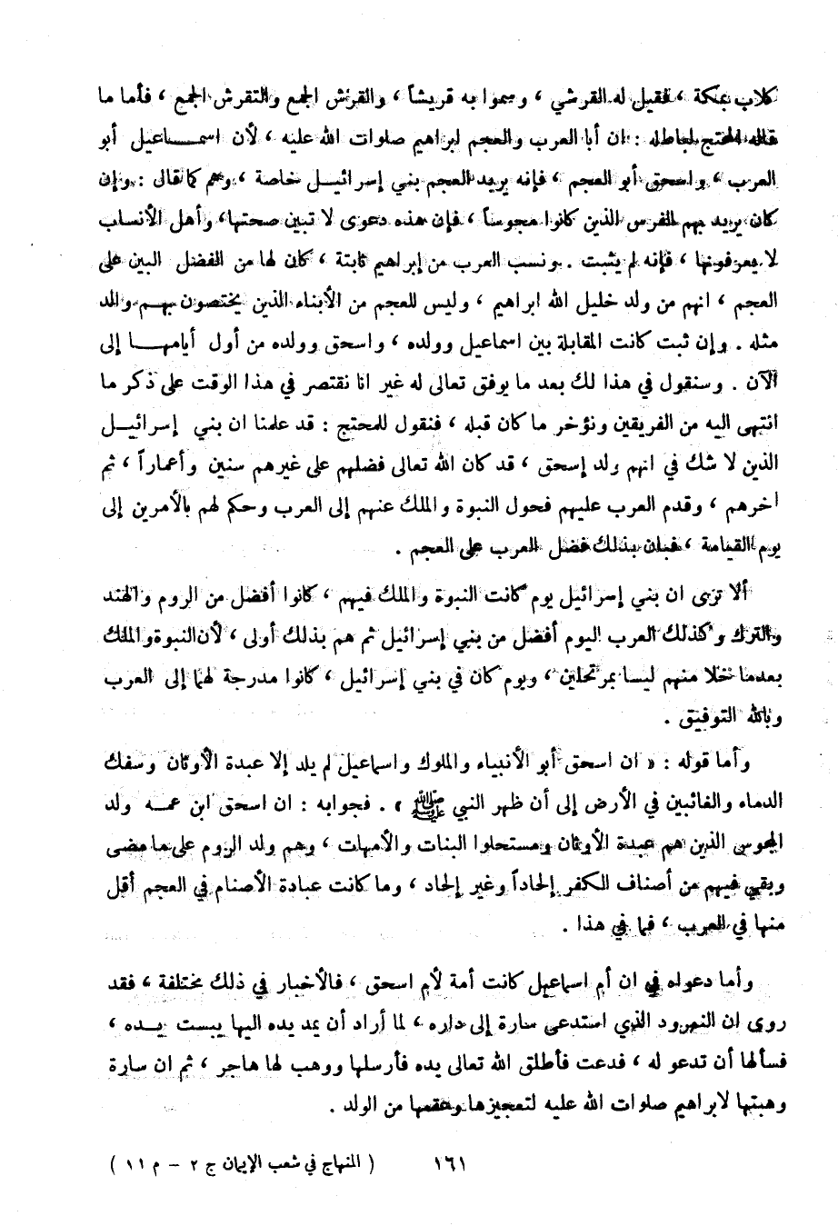 كلاب بمكة، فقيل له القرشي، وسموا به قريشًا، والقرش الجمع والتقرش الجمع، فأما ما قاله المحتج لباطله: إن أبا العرب والعجم إبراهيم صلوات الله عليه، لأن إسماعيل أبو العرب، واسحق أبو العجم، فإنه يريد العجم بني إسرائيل خاصة، وهم كما قال: وإن كان يريد بهم لما فرس الذين كانوا مجوسًا، فإن هذه دعوى لا تبين صحتها، وأهل الأنساب لا يعرفونها، فإنه لم يثبت. ونسب العرب من إبراهيم ثابتة، كان لها من الفضل البين على العجم، إنهم من ولد خليل الله إبراهيم، وليس للعجم من الأبناء الذين يختصون بهم والد مثله. وإن ثبت كانت المقابلة بين إسماعيل وولده، واسحق وولده من أول أيامها إلى ألآن. وسنقول في هذا لك بعد ما يوفق تعالى له غير أنا نقتصر في هذا الوقت على ذكر ما انتهى إليه من الفريقين ونؤخر ما كان قبله، فنقول للمحتج: قد علمنا أن بني إسرائيل الذين لا شك في أنهم ولد إسحق، قد كان الله تعالى فضلهم على غيرهم سنين وأعمارًا، ثم أخرهم، وقدم العرب عليهم فحول النبوة والملك عنهم إلى العرب وحكم لهم بالأمرين إلى يوم القيامة، فبان بذلك فضل العرب على العجم.