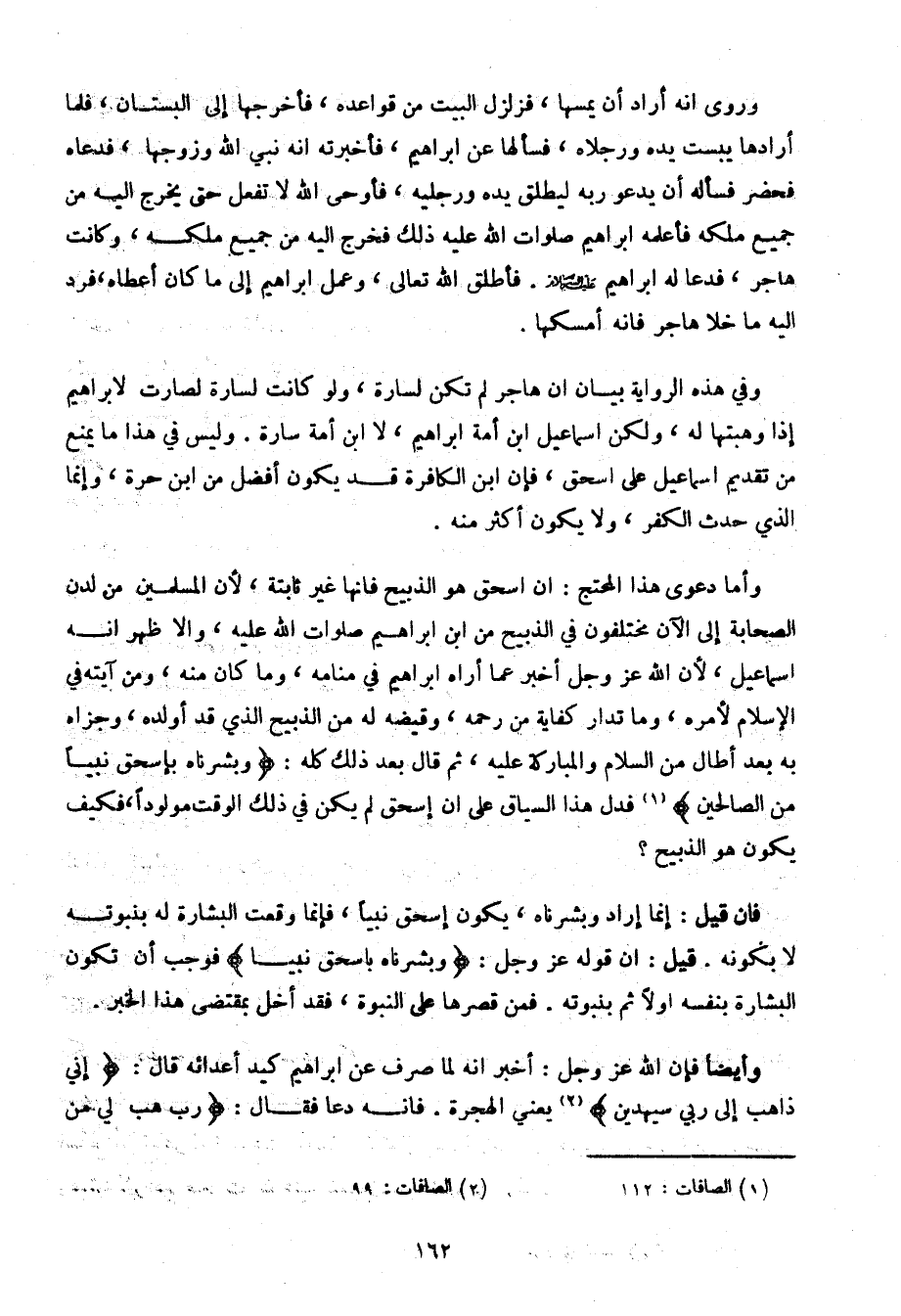 وأما دعوى هذا المحتج: أن اسحق هو الذبيح فإنها غير ثابتة، لأن المسلمين من لدن الصحابة إلى الآن مختلفون في الذبيح من ابن إبراهيم صلوات الله عليه، وإلا ظهر أنه إسماعيل، لأن الله عز وجل أخبر عما أراه إبراهيم في منامه، وما كان منه، ومن آيته في الإسلام لأمره، وما تدار كفاية من رحمه، وقيضه له من الذبيح الذي قد أولده، وجزاه به بعد أطال من السلام والمباركة عليه، ثم قال بعد ذلك كله:} وبشرناه باسحق نبيًا من الصالحين {فدل هذا السياق على أن إسحق لم يكن في ذلك الوقت مولودًا، فكيف يكون هو الذبيح؟