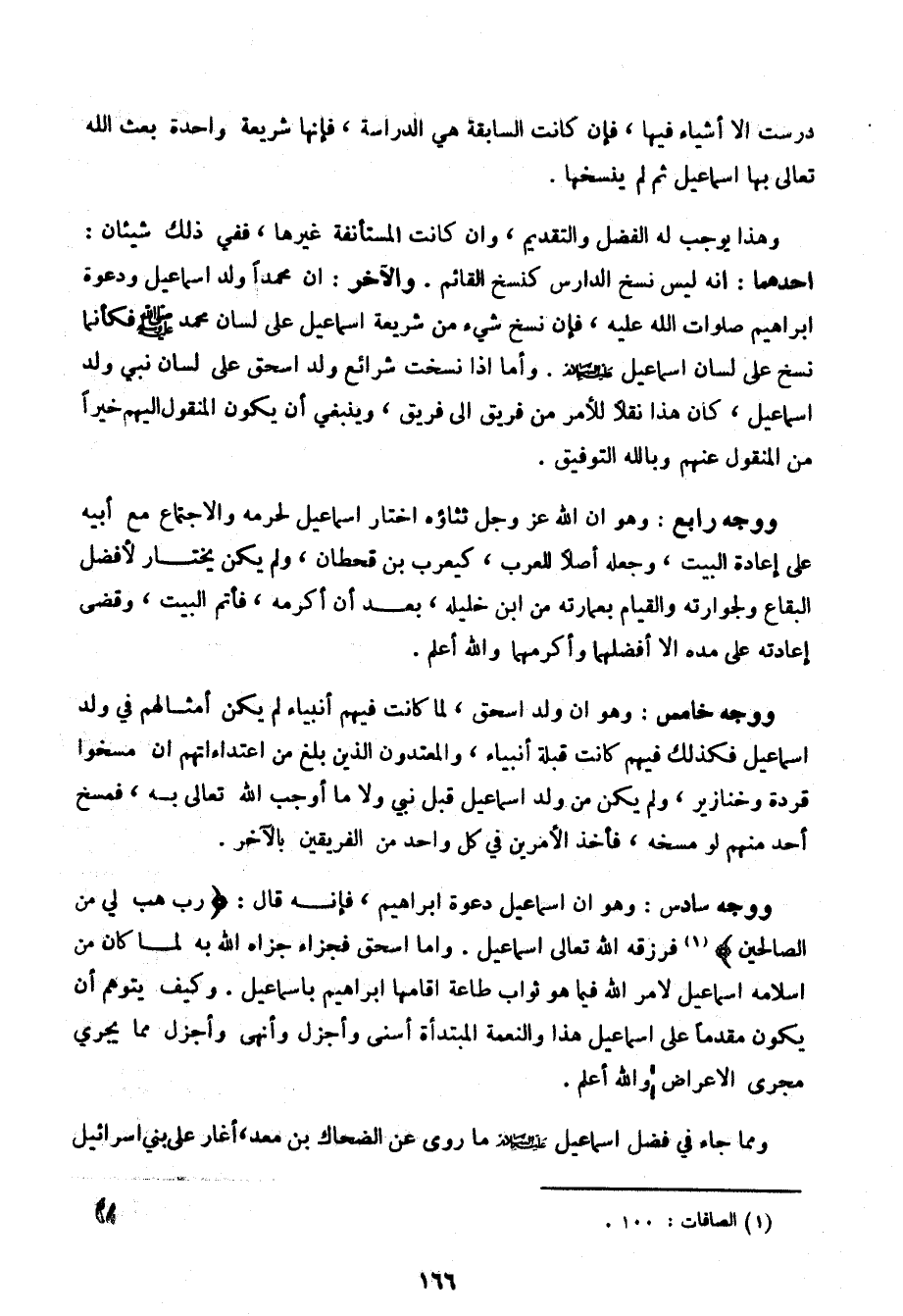 أحدهما: أنه ليس نسخ الدارس كنسخ القائم. والآخر: أن محمدًا ولد إسماعيل ودعوة إبراهيم صلوات الله عليه، فإن نسخ شيء من شريعة إسماعيل على لسان محمد صلى الله عليه وسلم فكأنما نسخ على لسان إسماعيل عليه السلام. وأما إذا نسخت شرائع ولد اسحق على لسان نبي ولد إسماعيل، كان هذا نقلاً للأمر من فريق إلى فريق، وينبغي أن يكون المنقول إليهم خيرًا من المنقول عنهم وبالله التوفيق.
