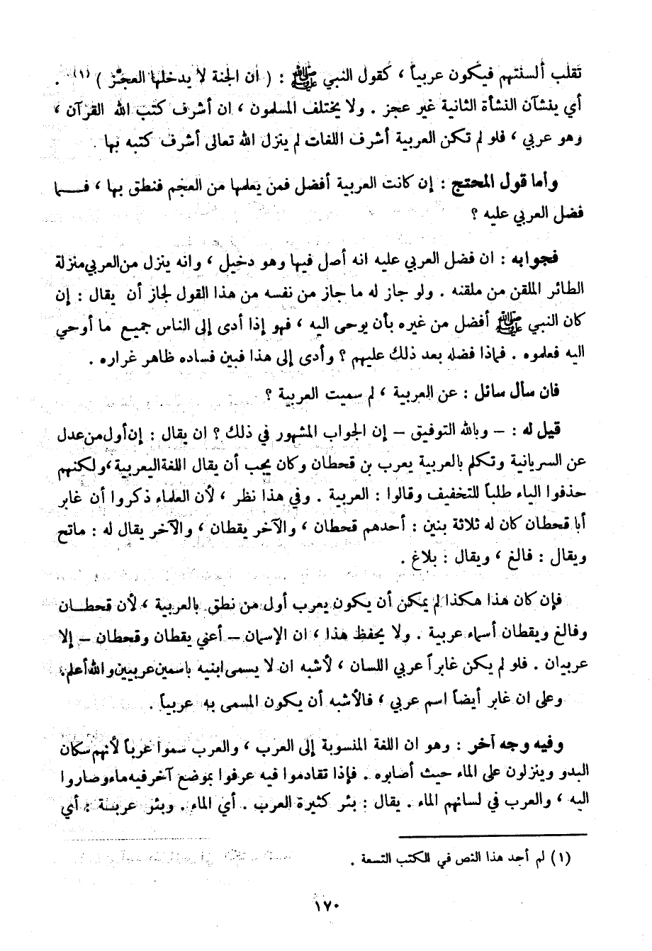 تقلب ألسنتهم فيكون عربيًا، كقول النبي صلى الله عليه وسلم: (أن الجنة لا يدخلا العجز). أي نشآن النشأة الثانية غير عجز. ولا يختلف المسلمون، أن أشرف كتب الله القرآن، وهو عربي، فلو لم تكن العربية أشرف اللغات لم ينزل الله تعالى أشرف كتبه بها.