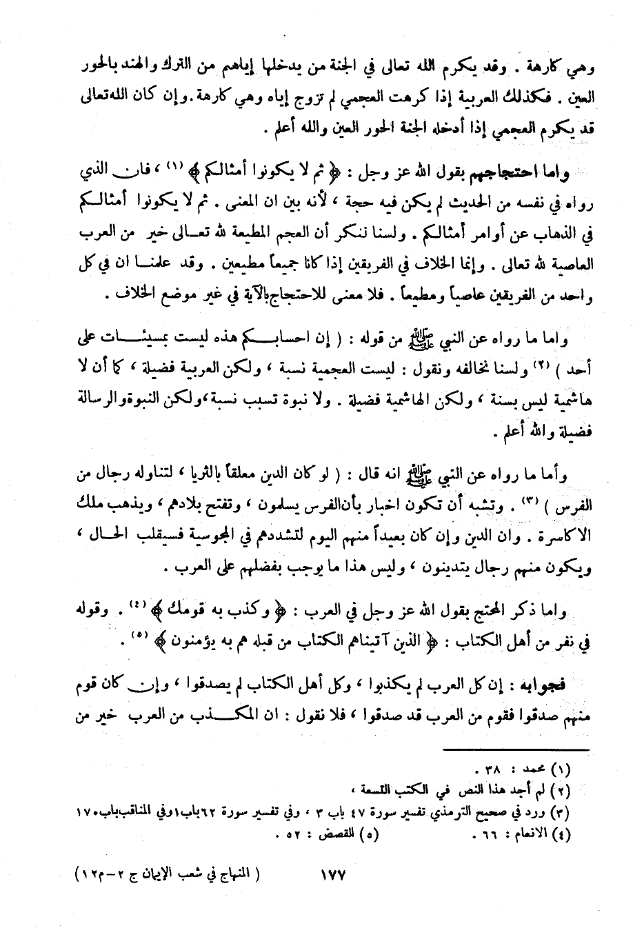 وأما احتجاجهم بقول الله عز وجل:} ثم لا يكونوا أمثالكم {، فإن الذي رواه في نفسه من الحديث لم يكن فيه حجة، لأنه بين أن المعنى. ثم لا يكونوا أمثالكم في الذهاب عن أوامر أمثالكم. ولسنا ننكر أن العجم المطيعة لله تعالى خير من العرب العاصية لله تعالى. وإنما الخلاف في الفريقين إذا كانا جميعًا مطيعين. وقد علمنا أن في كل واحد من الفريقين عاصيًا ومطيعًا. فلا معنى للاحتجاج بالآية في غير موضع الخلاف.