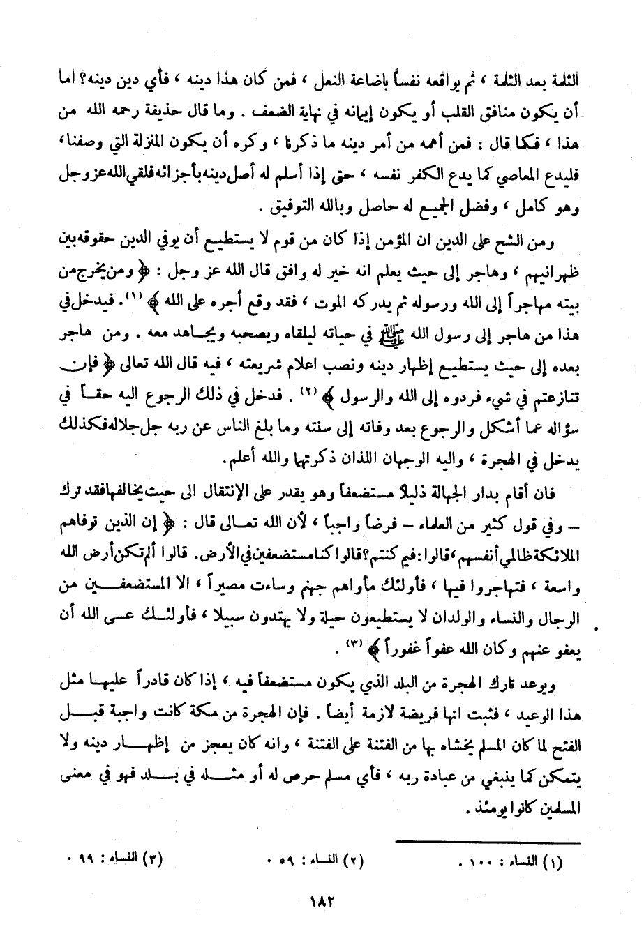 ويوعد تارك الهجرة من البلد الذي يكون مستضعفًا فيه، إذا كان قادرًا عليها مثل هذا الوعيد، فثبت أنها فريضة لازمة أيضًا. فإن الهجرة من مكة كانت واجبة قبل الفتح لما كان المسلم يخشاه بها من الفتنة على الفتنة، وأنه كان يعجز من إظهار دينه ولا يتمكن كما ينبغي من عبادة ربه، فأي مسلم حرص له أو مثله في بلد فهو في معنى المسلمين كانوا يومئذ.