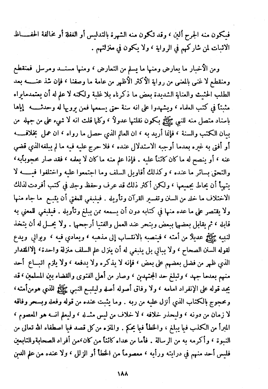 ومن الأخبار ما يعارض ومنها ما يلم من التعارض، ومنها مسند ومرسل فمنقطع ومنقطع لا غنى بالمعنى من رواية الأكثر الأظهر من عامة ما وصفنا، فإن شذ عنه بعد الطلب الحثيث والعناية الشديدة بعض ما ذكرناه بلا غلبة ولكنه لا علم له أن يعتمد ما يراه مثبتًا في كتب العلماء، ويشهدوا على أنه سنة حتى يسمعها فمن يرويها له وحدثه إياها بإسناد متصل منه للنبي صلى الله عليه وسلم بكون نقلتها عدولاً، وكلما قلت أنه لا شيء على من جهله من بيان الكتب والسنة، فإنما أريد به، إن العالم الذي حصل ما رواه، إن عمل بخلافه أو أفتى به غيره بعدما أوجبه الاستدلال عنده، فلا حرج عليه فيه ما لم يبلغه الذي قضي عنه، أو ينصح له ما كان كائنًا عليه. فإذا علم منه ما كان لا يعلمه، فقد صار محجوبًا به، والتحق بسائر ما عنده، وكذلك أقاويل السلف وما اجتمعوا عليه واختلفوا فيه لا يتهيأ أن يحاط بجميعها، ولكن أكثر ذلك قد عرف وحفظ وجلد في كتب أفردت لذلك الاختلاف ما خلد من السنن وتفسير القرآن وتأويله. فينبغي للمفتي أن يتبع ما جاء منها ولا يقتصر على ما عده منها في كتابه دون أن يسمعه ممن يبلغ وتأويله. فينبغي للمعنى به قابله، ثم يقابل بعضهما ببعض ويتحر عند العمل والفتيا أرجحهما. ولا يحل له أن يتخذ لنبيه صلى الله عليه وسلم عديلاً من أمته، فينصبه بالانتساب إلى مذهبه، ويعادي فيه، ويوالي ويدع لقوله السنن الصحاح، ولا يبالي بل ينبغي له أن ينزل علم السلف منزلة واحدة، إلا المقدار الذي ظهر من فضل بعضهم على بعض، فإنه لا يذكره ولا يدفعه، ولا يلزم إتباع أحد منهم بعدما جهد، وتبلغ حد المجتهدين، وصار من أهل الفتوى والقضاء بين المسلمين، قد يجد قوله على الإنفراد أمامه، ولا وفاق أصوله أصله وليتبع النبي صلى الله عليه وسلم الذي هو من أمته، ومحجوج بالكتاب الذي أنزل عليه من ربه. وما يثبت عنده من قوله وفعله وبسحر وفاقه لا زمان من دونه، وليحذر خلافه، لا خلاف من ليس مثله، وليعلم أنه هو المعصوم، المبرأ من الكذب فيما يبلغ، والخطأ فيما يحكم. والمنزه من كل قصد فيما اصطفاه الله تعالى من النبوة، وأكرمه به من الرسالة. فأما من عداه كائنًا من كان، من أفراد الصحابة والتابعين فليس أحد منهم في درايته ورأيه، معصومًا من الخطأ أو الزلل، ولا عنده من علم الدين