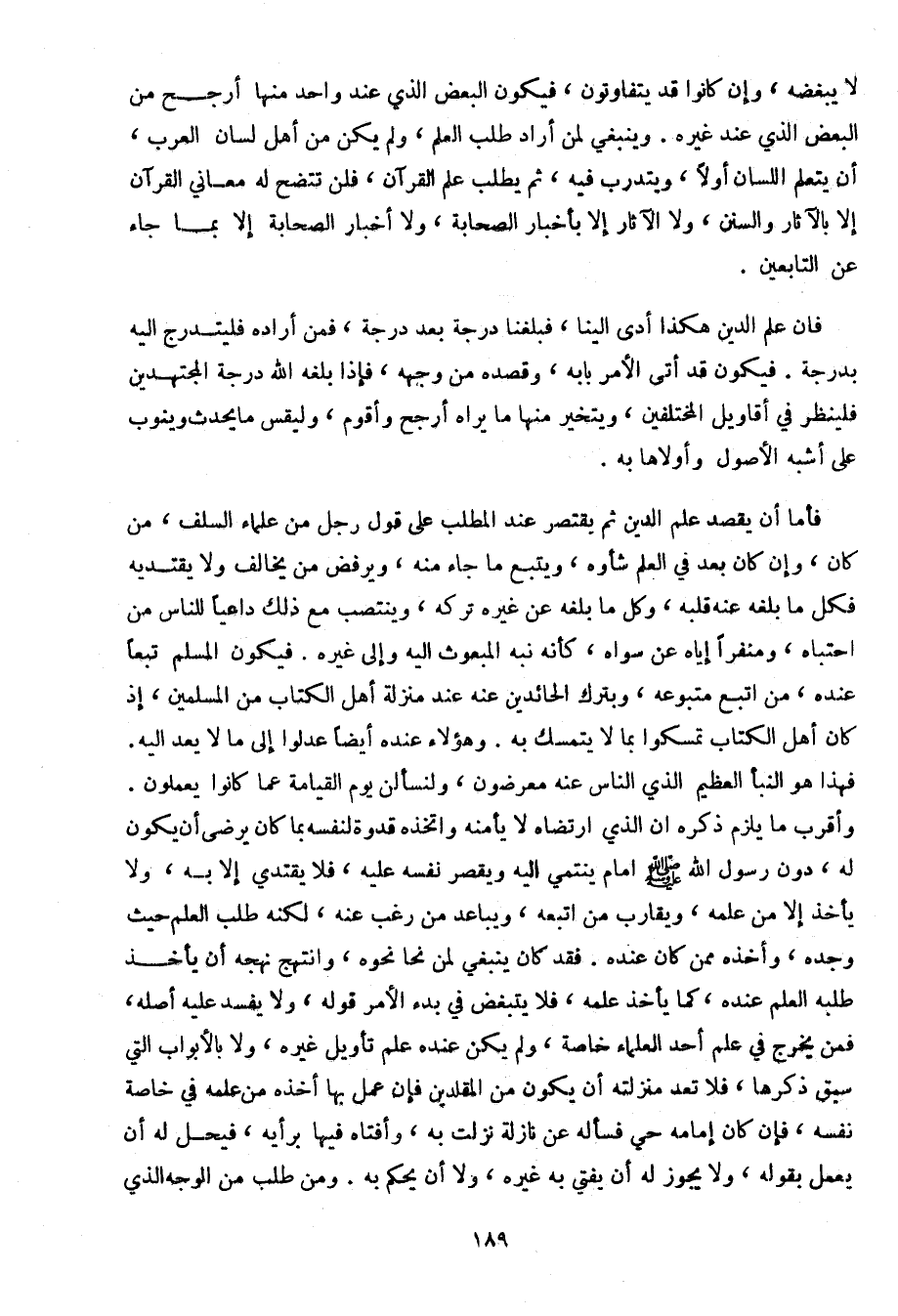 فإن علم الدين هكذا أدى إلينا، فبلغنا درجة بعد درجة، فمن أراده فليتدرج إليه بدرجة. فيكون قد أتى الأمر بابه، وقصده من وجهه، فإذا بلغه الله درجة المجتهدين فلينظر في أقاويل المختلفين، ويتخير منها ما يراه أرجح وأقوم، وليقس ما يحدث وينوب على أشبه الأصول وأولاها به.