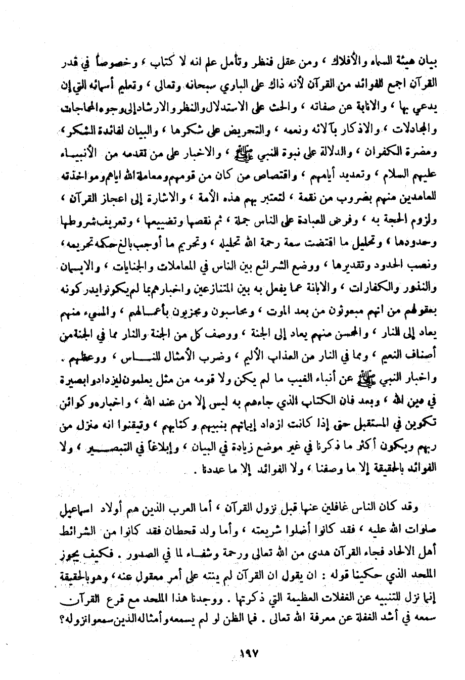 وقد كان الناس غافلين عنها قبل نزول القرآن، أما العرب الذين هم أولاد إسماعيل صلوات الله عليه، فقد كانوا أضلوا شريعته، وأما ولد قحطان فقد كانوا من الشرائط أهل الإلحاد فجاء القرآن هدى من الله تعالى ورحمة وشفاء لما في الصدور. فكيف يجوز الملحد الذي حكينا قوله: أن يقول إن القرآن لم ينته على أمر معقول عنه، وهو بالحقيقة إنما نزل للتنبيه عن الغفلات العظيمة التي ذكرتها. ووجدنا هذا الملحد مع قرع القرآن سمعه في أشد الغفلة عن معرفة الله تعالى. فما الظن لو لم يسمعه وأمثاله الذين سمعوا نزوله؟