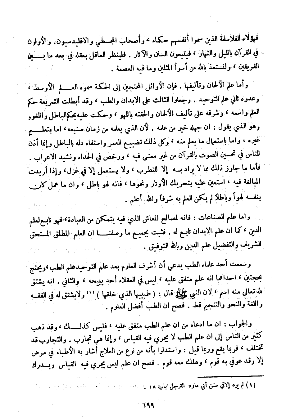 وأما علم الألحان وتأليفها. فإن الأوائل المحتجين إلى الحكمة سموه العلم الأوسط، وعدوه ثاني علم التوحيد. وجعلوا الثالث على الأبدان والطب، وقد أبطلت الشريعة حكم العلم واسمه، وشرفه على تأليف الألحان والحقته باللهو، وحكمت عليه بحكم الباطل واللغو وهو الذي يقول: إن جهله خير من علمه. لأن الذي يعلمه من زمان صنيعه، إما بتعليم غيره، وإما باستعمال ما يعلم منه، وكل ذلك تضييع للعمر واستفاء دله بالباطل وإنما أذن للناس في تحسين الصوت بالقرآن من غير معنى فيه، ورخص في الحداء ونشيد الإعراب. فأما ما جاوز ذلك مما لا يراد به إلا للتطرب، ولا يستعمل إلا في غزل، وإذا أريدت المبالغة فيه، استعين عليه بتحريك الأوتار ونحوها، فإنه لهو باطل، وإن ما عمل كان بنفسه لهوًا وباطلاً لم يكن العلم به شرفًا والله أعلم.