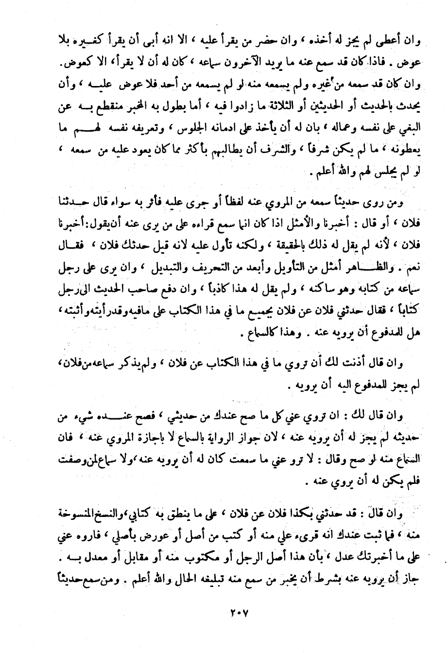 وإن قال: قد حدثني بكذا فلان عن فلان، على ما ينطق به كتابي، والنسخ المنسوخة منه، فما ثبت عندك أنه قرئ علي منه أو كتب من أصل أوعورض بأصلي، فاروه عني على ما أخبرتك عدل، بأن هذا أصل الرجل أو مكتوب منه أو مقابل أو معدل به. جاز أن يرويه عنه بشرط أن يخبر من سمع منه تبليغه الحال والله أعلم. ومن سمع حديثًا