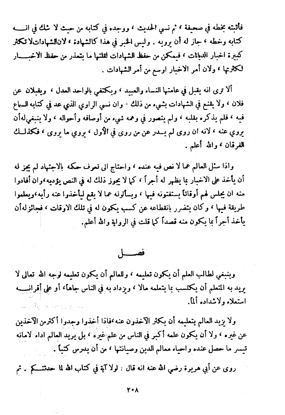 ألا ترى أنه يقبل في عامتها النساء والعبيد، ويكتفي بالواحد العدل، ويقبلان عن فلان، ولا يقنع في الشهادات بشيء من ذلك. وإن نسي الراوي الذي عد في كتابه السماع فيه، فلم يذكره بقلبه، ولم يتصور في وهمه شيء من أوصافه وأحواله، ولا ينبغي له أن يروي عنه، لأنه أن روى لم يدر عن من روى في الأول، يروي ما يروي، فكذلك الفرقان، والله أعلم.