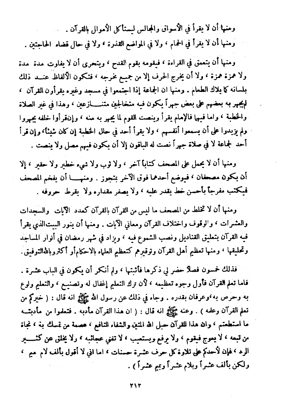 فذلك خمسون فصلاً حضر لي ذكرها فأثبتها، ولم أنكر أن يكون في الباب عشرة. فأما تعلم القرآن فأول وجوه تعظيمه، لأن ترك التعليم إغفال له وتصنيع، والتعليم ولوع به وحرص به، وعرفان بقدره. وجاء في ذلك عن رسول الله صلى الله عليه وسلم أنه قال: (خيركم من تعلم القرآن وعلمه). وعنه صلى الله عليه وسلم أنه قال: (إن هذا القرآن مأدبه. فتعلموا من مأدبته ما استطعتم، وإن هذا القرآن حبل الله المتين والشفاء النافع، عصمة من تمسك به، نجاة من تبعه، لا يعوج فيقوم، ولا يرفع ويستعيب، لا تغني عجائبه، ولا يخلق عن كثير الرد، فإن لأحدكم على تلاوة كل حرف عشرة حسنات، أما إني لا أقول بألف لام ميم، ولكن بألف عشرًا وبلام عشرًا وبميم عشرًا).